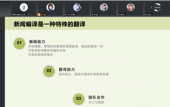 同学们结合具体案例,积极分享自己在编译中的心得体会。大家纷纷表示,通过新闻编译及配音的实习工作,充分了解了新闻编译的工作流程和原则,锻炼了专业能力,增强了团队合作意识,拓展了职业发展视野,获益匪浅。