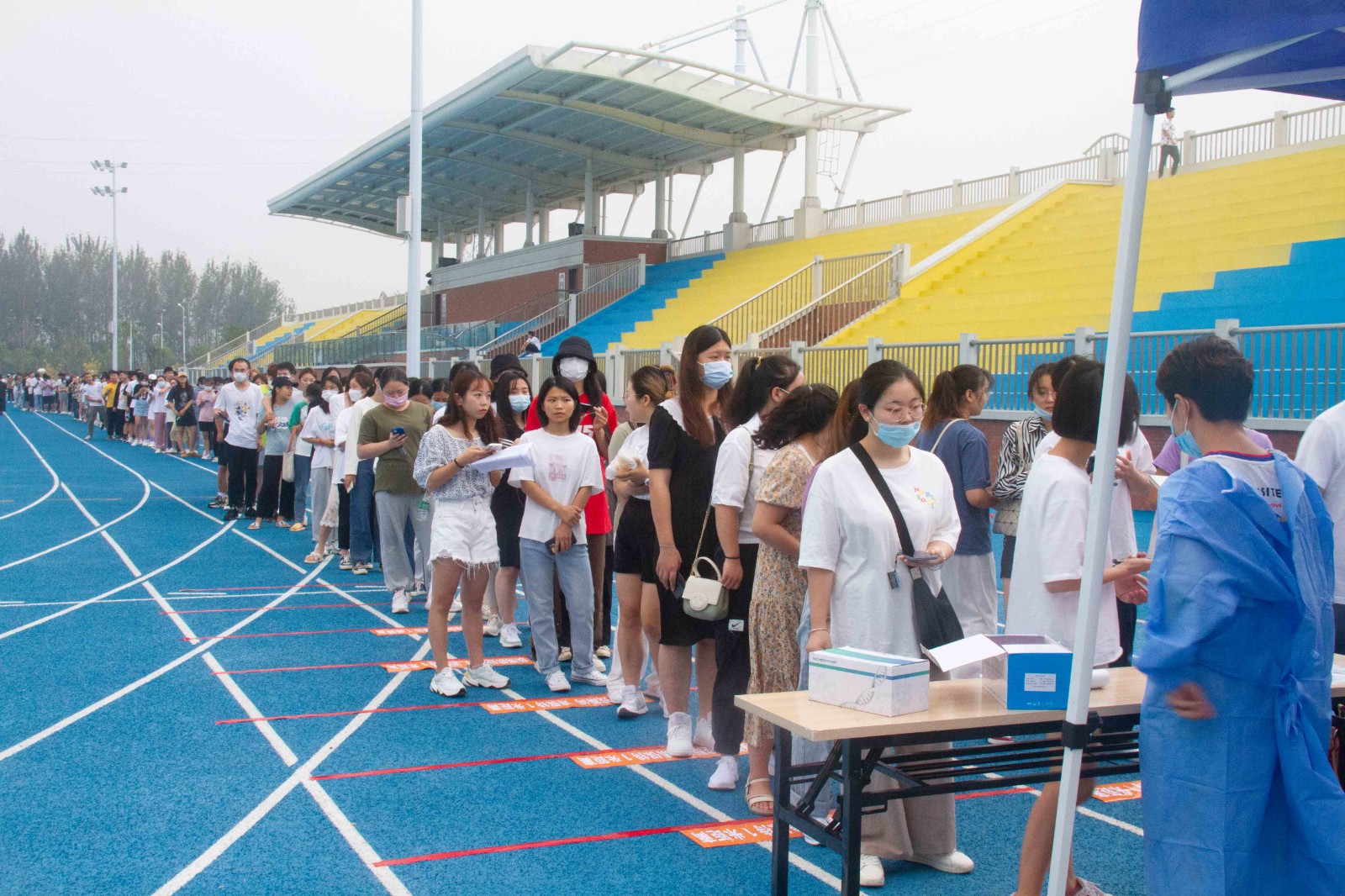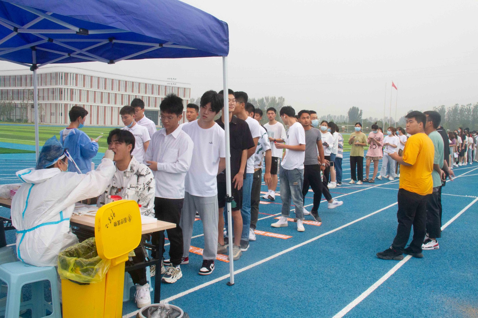 上午8时,核酸检测工作正式开始。我校在田径运动场设置检测采样点。医护人员身穿防护服,冲锋在核酸检测一线。在检测现场,全体新生在相关工作人员的指引下,秩序井然地耐心排好队,经过身份核对和记录信息后,有序地来到检测台,接受医务人员的核酸采样,采样结束后,从一侧有序离开,整个采样工作既有条不紊又高效快速,用实际行动保障了检测工作的安全、有序、规范开展。