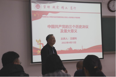 为了切实提升马克思主义学院与经济管理学院首届入党积极分子培训班学员的培训质量,按照学校和学院的培训计划,2022年4月12日晚,在二教422教室,淮北理工学院副校长汪建利同志来到马克思主义学院与经济管理学院分党校入党积极分子培训班,受邀对学员进行题为《中国共产党的三个历史决议及重大意义》的党课培训。本次活动由马克思主义学院与经济管理学分党校负责人、党总支书记吴玲院长主持,总支各个党支部书记及全体入党积极分子培训班全体学员参加。