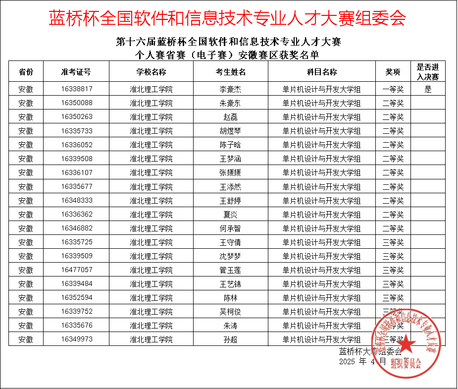 我校电子与信息工程学院学子凭借扎实专业功底在第十六届“蓝桥杯”全国软件和信息技术专业人才大赛全国总决赛中,获国家一等奖1项、国家二等奖1项、国家三等奖2项;在第十六届“蓝桥杯”全国软件和信息技术专业人才大赛安徽赛区,获省级一等奖4项、省级二等奖14项、省级三等奖13项。