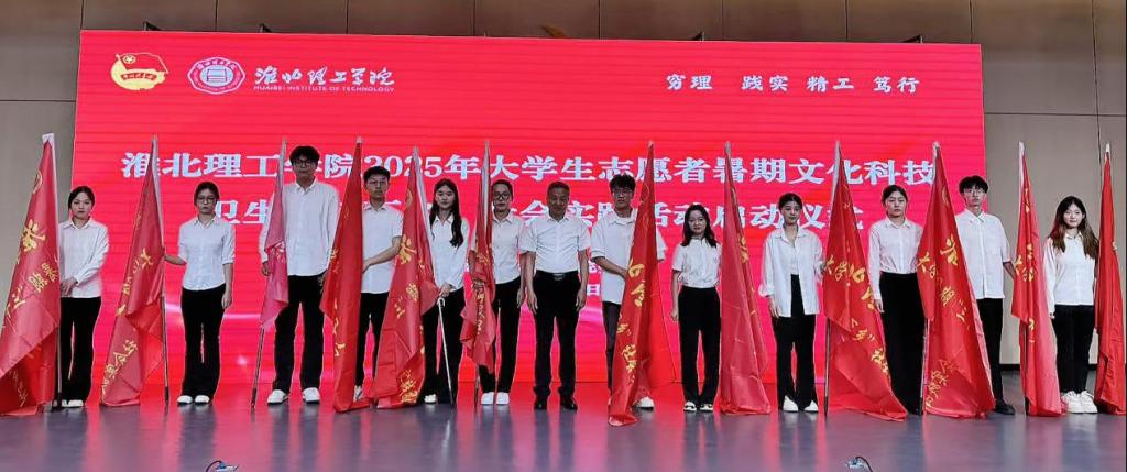 党建办主任付金沐宣读2025年暑期“三下乡”校级重点团队及校级团队立项团队名单。淮北市各红色场馆负责人为“红色基地鉴党史,青年学子践初心”党史学习教育实践团队颁发聘书,并为校级实践团队代表授旗。