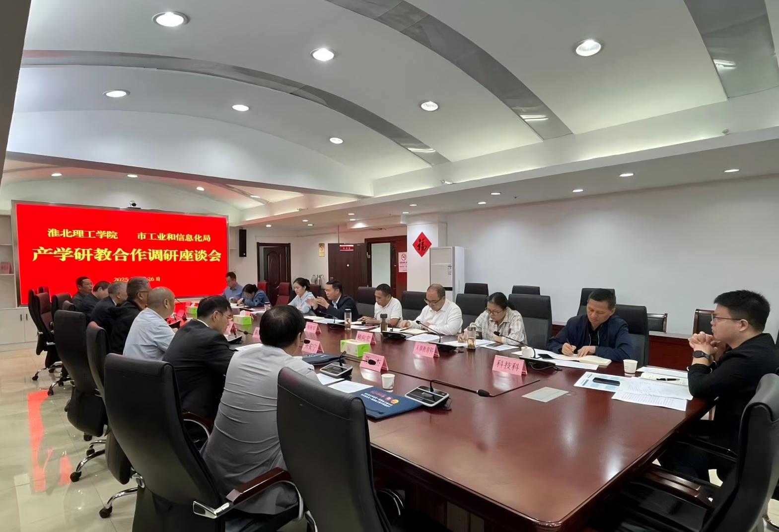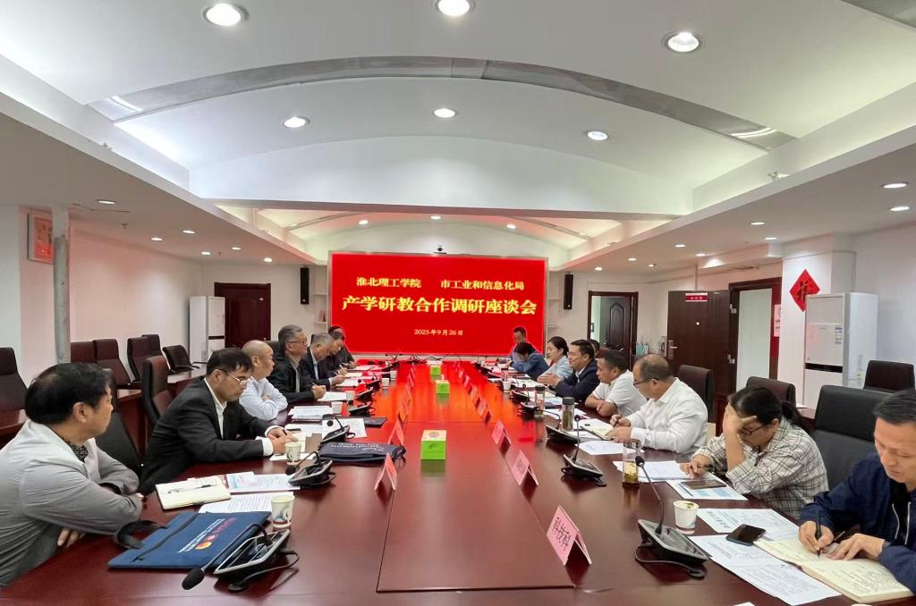 为精准对接地方产业发展需求,进一步推动产学研教深度融合,9月26日上午,学校校长杨兵、副校长汪建利及相关单位负责人赴淮北市工业和信息化局进行座谈交流。淮北市工业和信息化局局长王全军、副局长张海军、副局长张锦、党组成员赖向宏及有关科室负责人出席座谈。