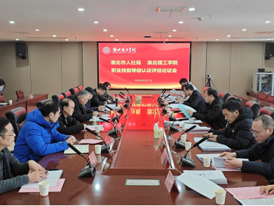 3月7日,我校与淮北市人力资源和社会保障局联合举办职业技能等级认定评估论证会。会议围绕学校申报职业技能等级认定的基础条件、实施方案等内容进行研讨评估。校长汪建利,市人社局副局长张华,评估专家以及学校相关部门负责人参加会议。