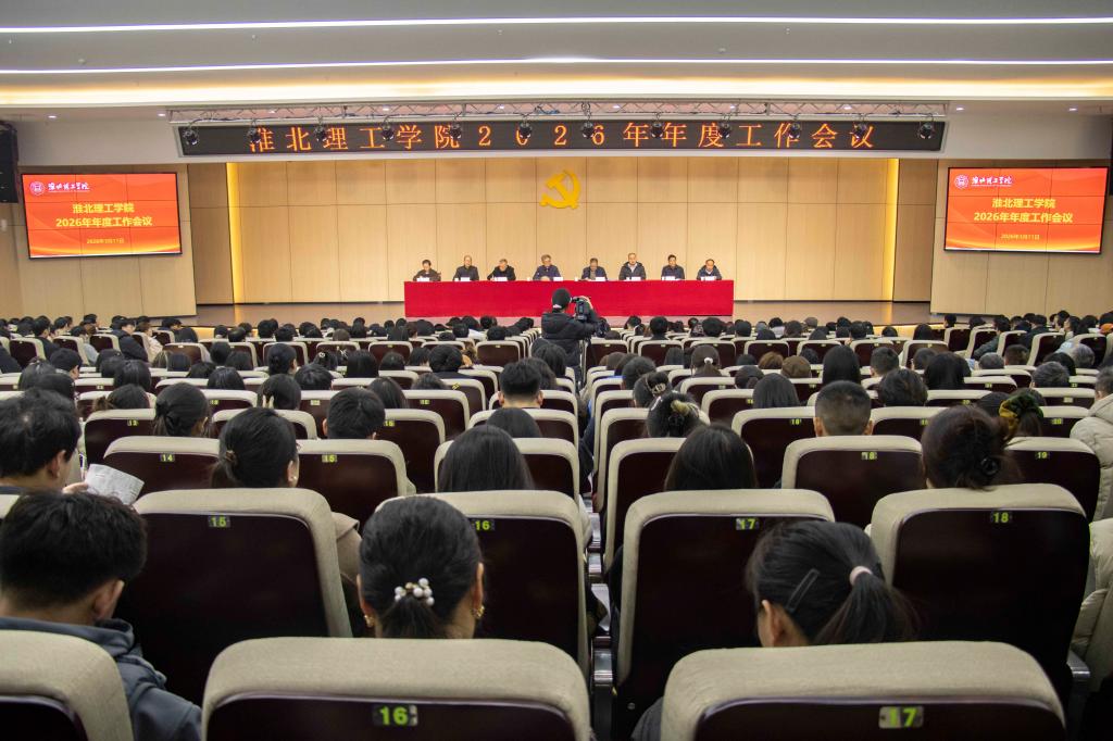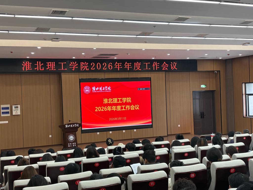3月11日下午,淮北理工学院2026年度工作会议在行政楼一楼报告厅隆重召开,大会同时在图书馆109报告厅设立分会场。校长杨兵向大会作题为《凝心聚力谋发展,砥砺奋进谱新篇》的主题报告,全面回顾总结2025年办学成果,系统部署2026年重点工作任务。校领导班子成员、各单位负责人及全体教职工参加会议。校党委书记朱德顺主持会议。