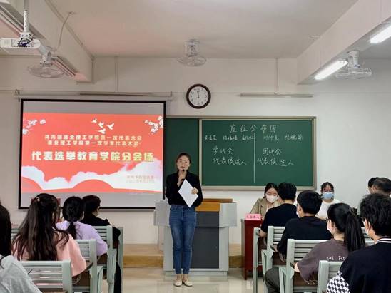 会议上,教育学院团总支副书记黄莹莹宣读此次代表候选人名单,并介绍了代表候选人投票选举流程及总监票人、计票人情况,宣读了选票填写注意事项。