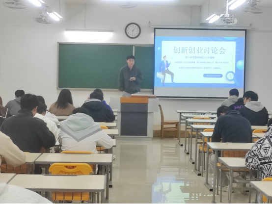 为了积极引导大四毕业生了解创业知识,培养创业意识,提高创业能力,11月22日电子与信息工程学院于二教323召开了创新创业讨论会。会议由学生会牵头,各班班委进行组织学习,就关于“深入学习贯彻党的二十大,全面提高人才自主培养质量,着力造就拔尖创新人才”为主题,同学们就自身的理想、创新创业想法及就业方向各抒己见,积极上台进行演讲与分享。