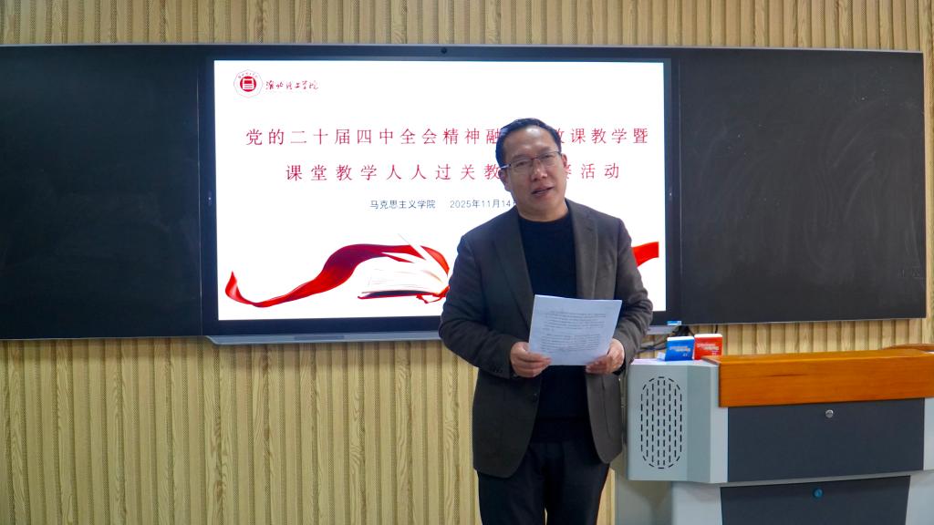 为深入学习贯彻党的二十届四中全会精神融入思政课教学、落实新时代教师队伍建设要求及学校“教学规范年”安排,全面提升思政课教师教学能力,马克思主义学院于11月14日举办党的二十届四中全会精神融入思政课教学暨“课堂教学人人过关”教学比赛活动。活动由学院副院长刘奔前主持,特邀淮北师范大学马克思主义学院阳勇、柳丽教授及学院银龄教师组成专家评委组,学院全体青年教师参赛。