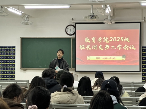 为了进一步加强班级建设,规范班级日常管理,常态化开展学生干部管理工作。11月24日下午,教育学院在2号教学楼417室召开2025级班长、团支书工作会议。学院团总支书记郭鸿鑫老师主持了会议。