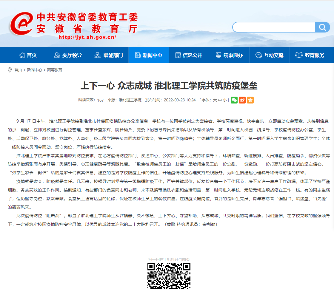 9 月 17 日中午,我校有一位同学被判定为密接者。学校高度重视,快字当头,立即启动应急预案。几天来,校领导时刻坚守第一线指挥防疫工作,严守关键部位,反复检查每一个工作环节,决不允许一点点工作疏漏,体现了学校严谨细致、务实高效的工作作风。安徽教育网首页对此进行了报道。