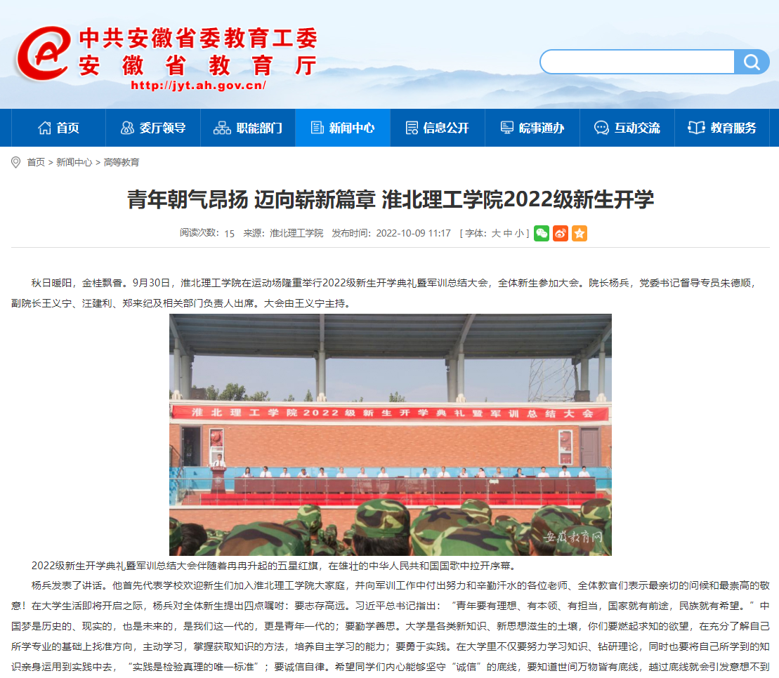 秋日暖阳,金桂飘香。9月30日,淮北理工学院在运动场隆重举行2022级新生开学典礼暨军训总结大会。安徽教育网首页对此进行了报道。