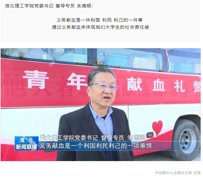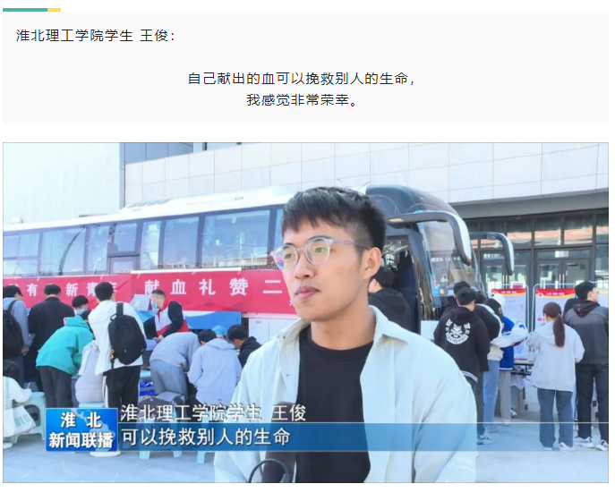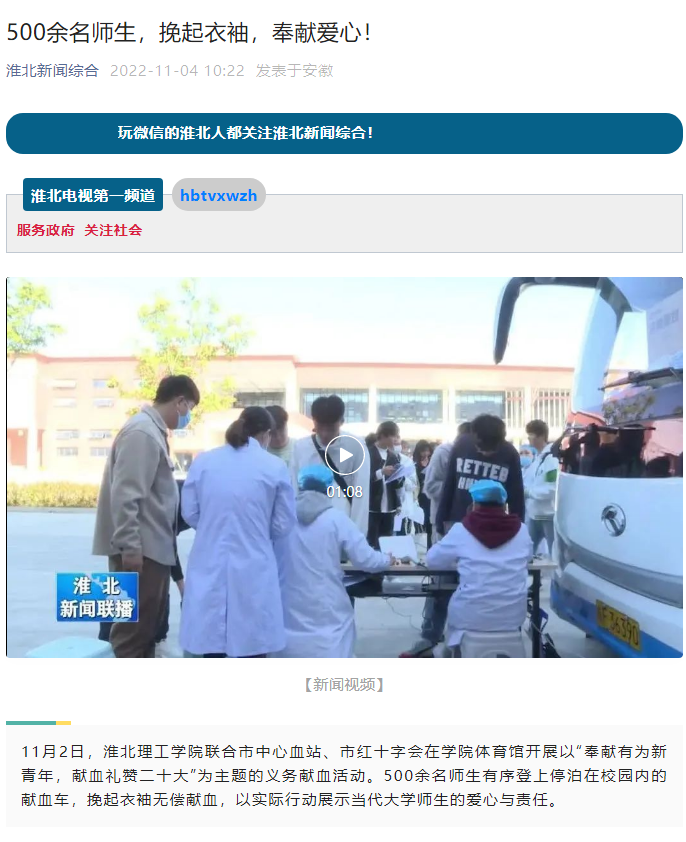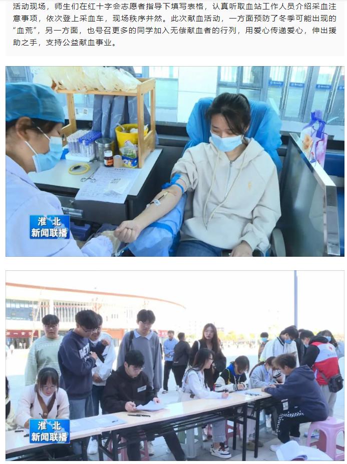 11月2日,淮北理工学院于体育馆门口开展“青春热血,传递温情”无偿献血活动,淮北新闻联播对此进行了报道。