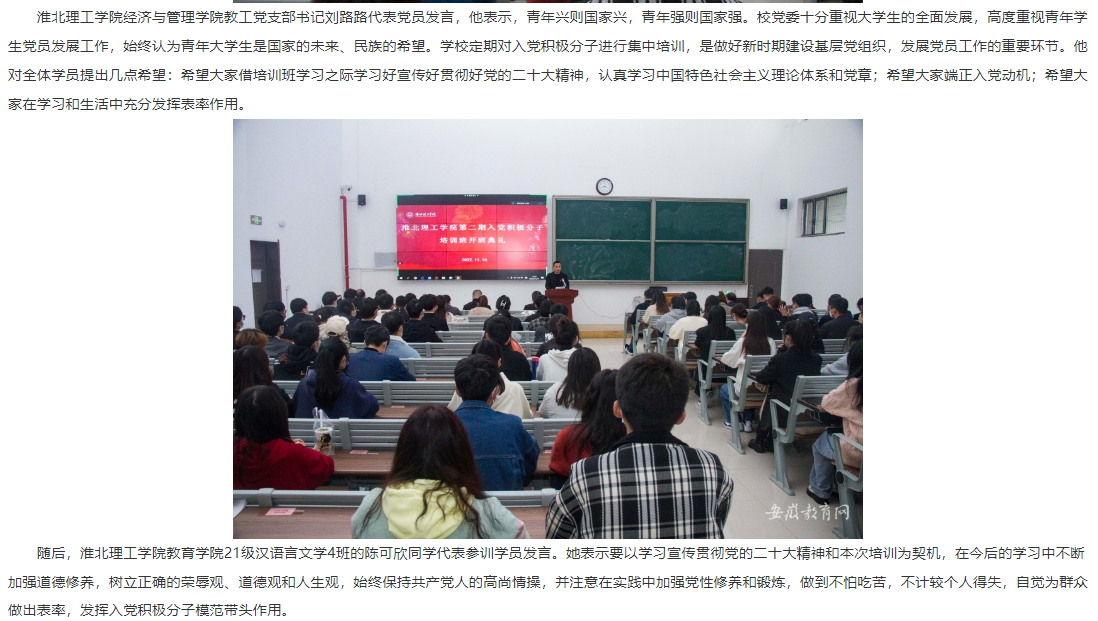 11月16日下午,淮北理工学院采用主会场与分会场相结合的方式举行第二期入党积极分子培训班开班仪式。出席本次开班仪式的有校党委书记、督导专员朱德顺,副院长郑来纪,各党总支、党支部书记,相关部门负责人及全体参训学员,校党委委员党建办主任付金沐主持开班仪式。安徽教育网对此进行了报道。