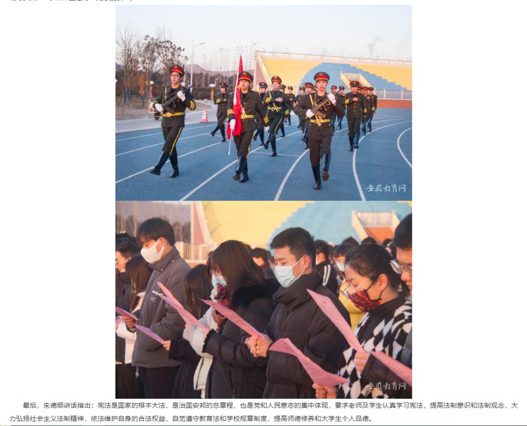 12月4日是第九个国家宪法日,为加强宪法学习宣传、弘扬宪法精神、普及宪法知识,淮北理工学院在运动场举行“宪法晨读”活动。安徽教育网对此进行了报道。