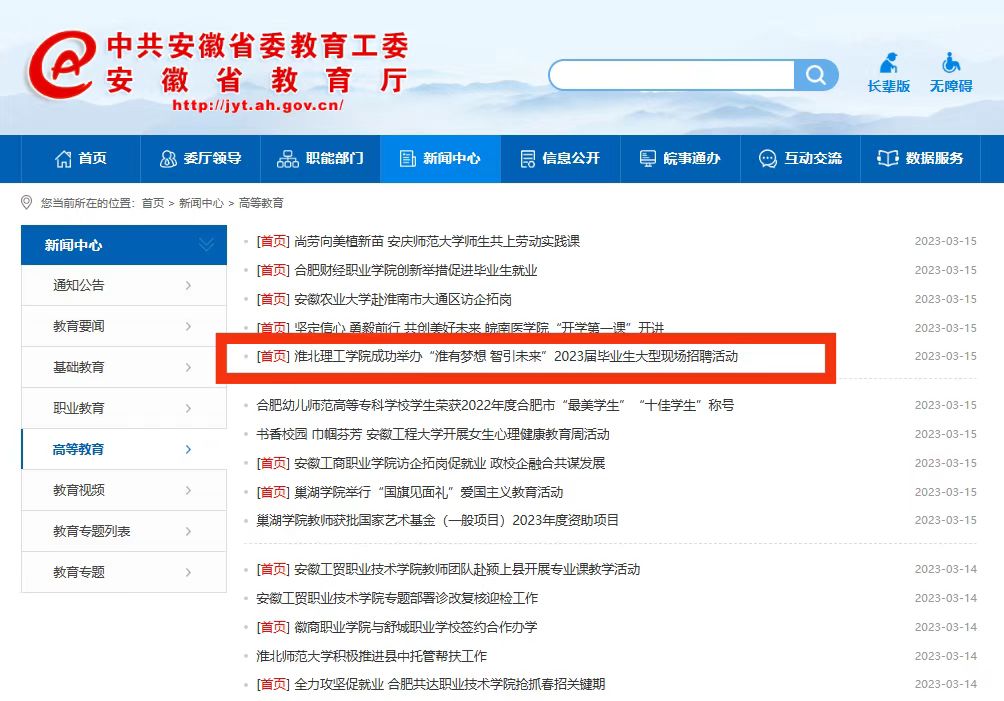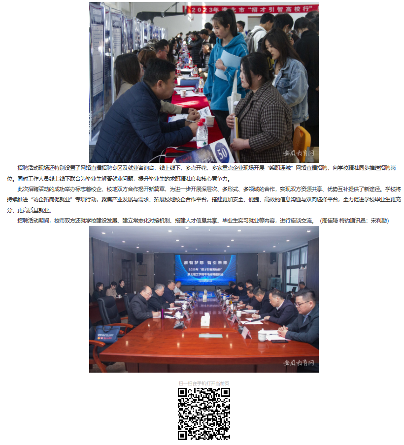 为深入贯彻党中央、国务院及省委、省政府“稳就业”“保就业”决策部署,积极做好高校毕业生就业工作,抓住高校毕业生春招“黄金期”,搭建用人单位与高校毕业生充分洽谈交流平台,积极为淮北市发展输送应用型人才。3月14日上午,淮北理工学院联合淮北市人力资源与社会保障局成功举办“淮有梦想 智引未来”2023届毕业生大型现场招聘活动。安徽教育网首页对此进行了报道。