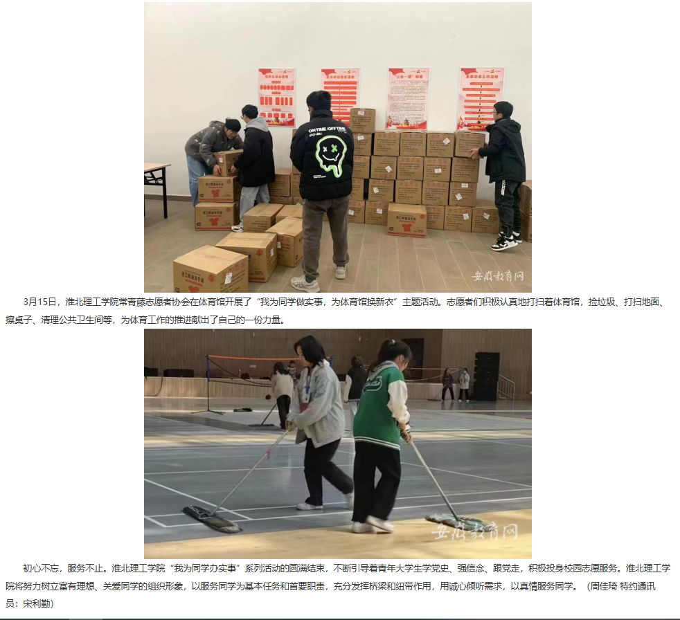 为贯彻落实党的二十大精神,践行“全心全意为人民服务”的宗旨,进一步聚焦同学所需,切实为同学们办实事、解难题,增强学生青年群体为同学做实事的思想,淮北理工学院于2月至3月份开展了“我为同学办实事”系列活动,安徽教育网对此进行了报道。