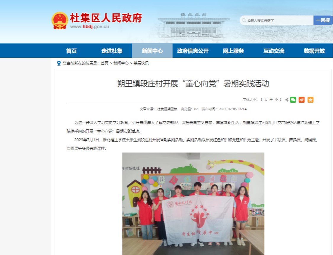 为进一步深入学习党史学习教育,引导未成年人了解党史知识,深植爱国主义思想,丰富暑期生活,朔里镇段庄村家门口党群服务站与淮北理工学院携手组织开展“童心向党”暑期实践活动。2023年7月1日,淮北理工学院大学生到段庄村开展暑期实践活动。实践活动以拓展红色知识和党建知识为主题,开展了书法课、舞蹈课、朗诵课、绘画课等多项兴趣课程。对此,杜集区人民政府网站进行了报道: