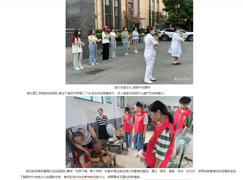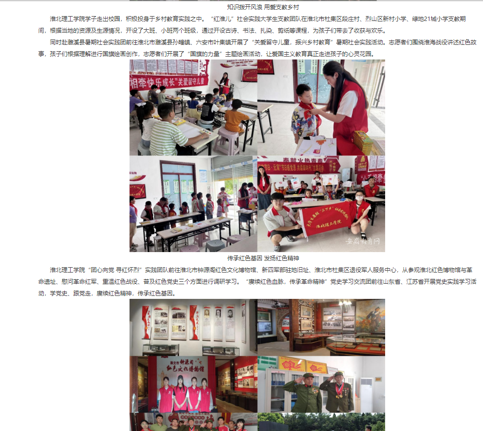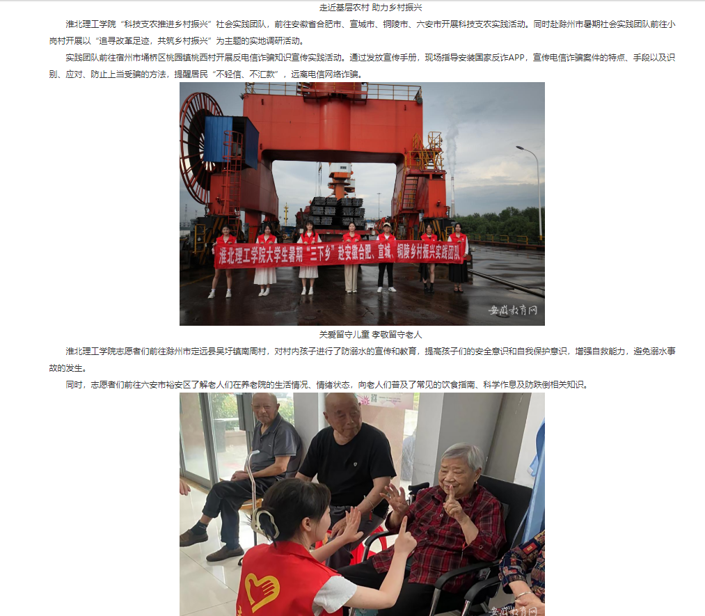 7月1日,淮北理工学院积极组建80支大学生社会实践团队,1000余名师生奔赴全国各地,用脚步丈量祖国大地,了解国情民情,深入乡村基层,感受振兴之美,至8月30日淮北理工学院2023年暑期大学生“三下乡”社会实践活动圆满收官。安徽教育网对此作了报道:http://jyt.ah.gov.cn/xwzx/gdjy/40669021.html