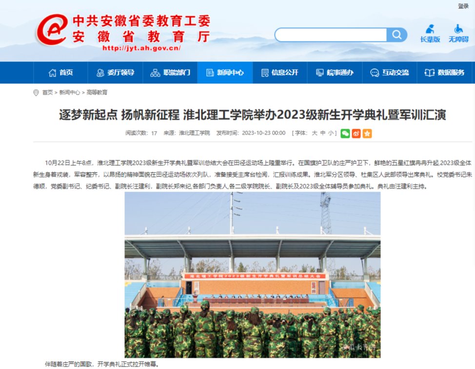 10月22日上午8点,淮北理工学院2023级新生开学典礼暨军训总结大会在田径运动场上隆重举行。在国旗护卫队的庄严护卫下,鲜艳的五星红旗冉冉升起,2023级全体新生身着戎装,军容整齐,以昂扬的精神面貌在田径运动场依次列队,准备接受主席台检阅,汇报训练成果。对此,安徽教育网进行了报道: