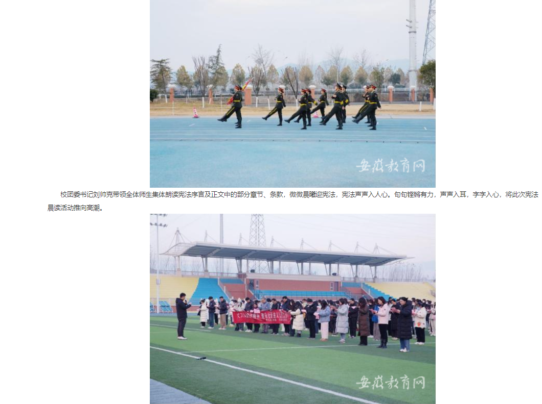 12月4日清晨,淮北理工学院举行“国家宪法日 宪法晨读”活动及升旗仪式。副院长郑来纪,学生处、校团委、教育学院负责人及各二级学院书记助理、全体辅导员、200余名学生代表参加本次活动。对此,安徽教育网进行了报道:
