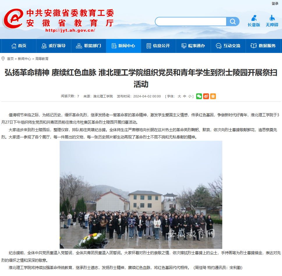 值清明节来临之际,为铭记历史,缅怀革命先烈,继承发扬老一辈革命家的革命精神,激发学生爱国主义情感,传承红色基因,争做新时代好青年,淮北理工学院于3月27日下午组织师生党员和共青团员前往淮北市杜集区革命烈士陵园开展扫墓活动。安徽教育网对此进行了报道。