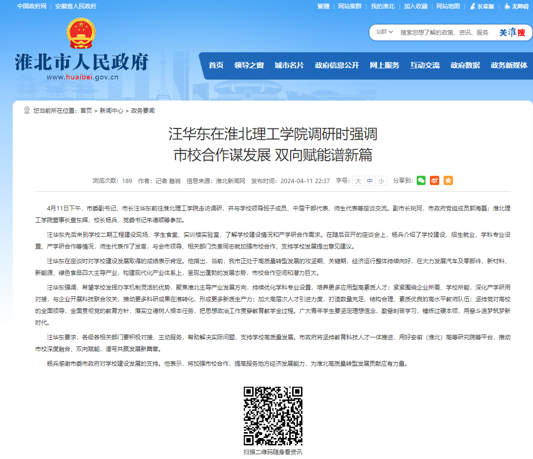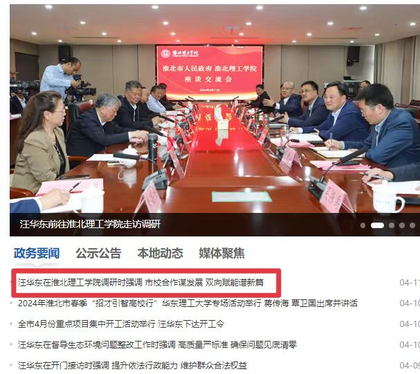 4月11日下午,市委副书记、市长汪华东前往淮北理工学院走访调研,并与学校领导班子成员、中层干部代表、师生代表等座谈交流。副市长姚珂,市政府党组成员郭海磊;淮北理工学院董事长查东辉,校长杨兵,党委书记朱德顺等参加。对此,淮北市人民政府在官网上进行了报道:
