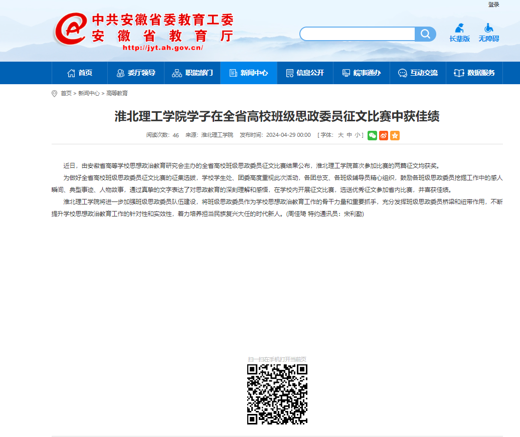 近日,由安徽省高等学校思想政治教育研究会主办的全省高校班级思政委员征文比赛结果公布,淮北理工学院首次参加比赛的两篇征文均获奖。对此,安徽教育网进行了报道: