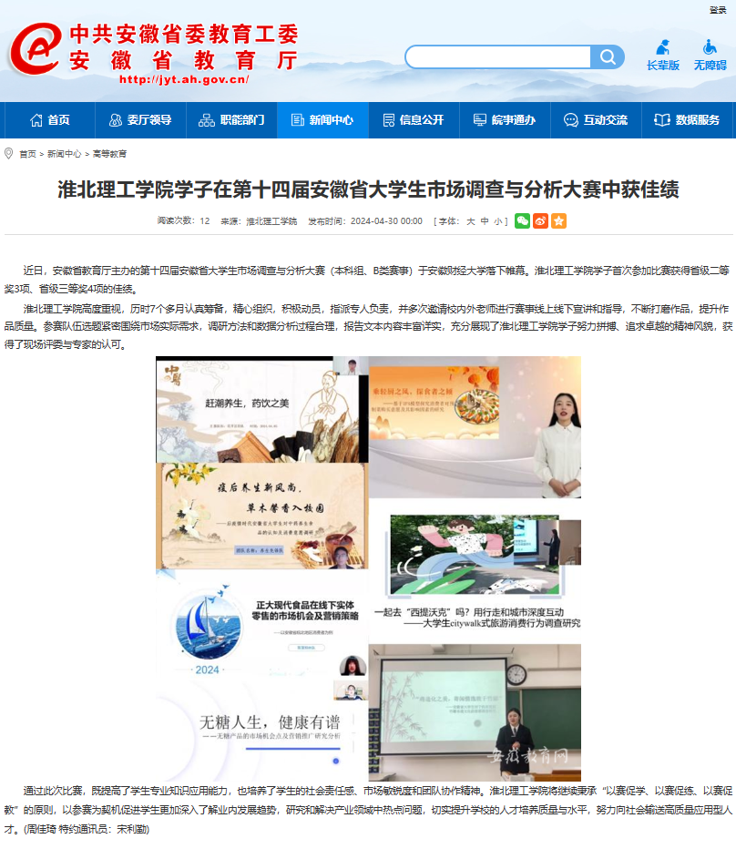 近日,安徽省教育厅主办的第十四届安徽省大学生市场调查与分析大赛(本科组、B类赛事)于安徽财经大学落下帷幕。淮北理工学院学子首次参加比赛获得省级二等奖3项、省级三等奖4项的佳绩。安徽教育网对此进行了报道。