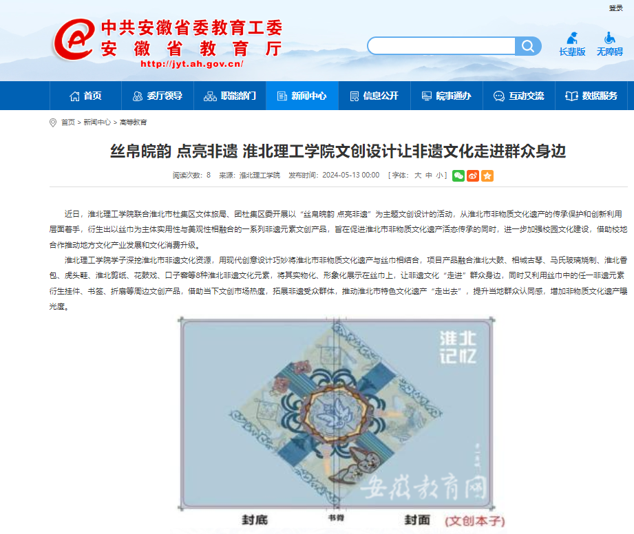 近日,淮北理工学院联合淮北市杜集区文体旅局、团杜集区委开展以“丝帛皖韵 点亮非遗”为主题文创设计的活动,从淮北市非物质文化遗产的传承保护和创新利用层面着手,衍生出以丝巾为主体实用性与美观性相融合的一系列非遗元素文创产品,旨在促进淮北市非物质文化遗产活态传承的同时,进一步加强校园文化建设,借助校地合作推动地方文化产业发展和文化消费升级。对此,安徽教育网进行了报道: