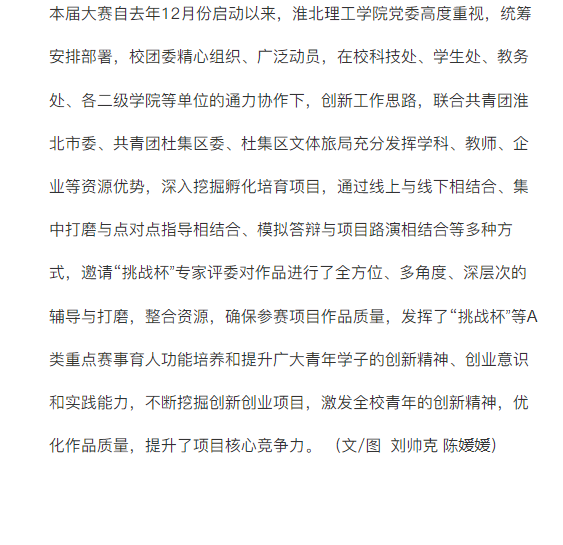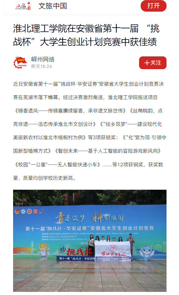 近日安徽省第十一届“挑战杯·华安证券”安徽省大学生创业计划竞赛决赛在芜湖市落下帷幕。经过决赛激烈角逐,淮北理工学院报送项目《锦香遗风——传锦囊赓续留香,承非遗文脉世传》《丝帛皖韵,点亮非遗——活态传承淮北市文创设计》《“绘乡筑梦”——建设现代化美丽新农村以淮北市梧桐村为例》等3项获银奖;《“化”繁为简·引领中国新型植棉方式》《智创未来——基于人工智能的冒险游戏新风向》《校园“一公里”——无人智能快递小车》……等12项获铜奖,获奖数量、质量均创学校历史新高。对此,文旅中国进行了报道: