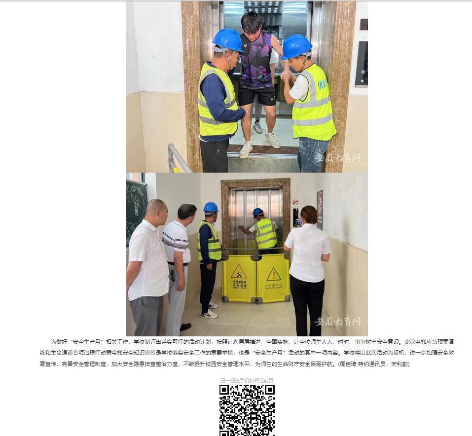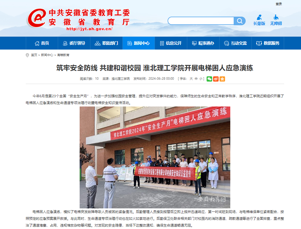 今年6月是第23个全国“安全生产月”,为进一步加强校园安全管理,提升应对突发事件的能力,保障师生的生命安全和正常教学秩序,淮北理工学院近期组织开展了电梯困人应急演练和生命通道专项治理行动暨电梯安全知识宣传活动。对此,安徽教育网首页进行了报道: