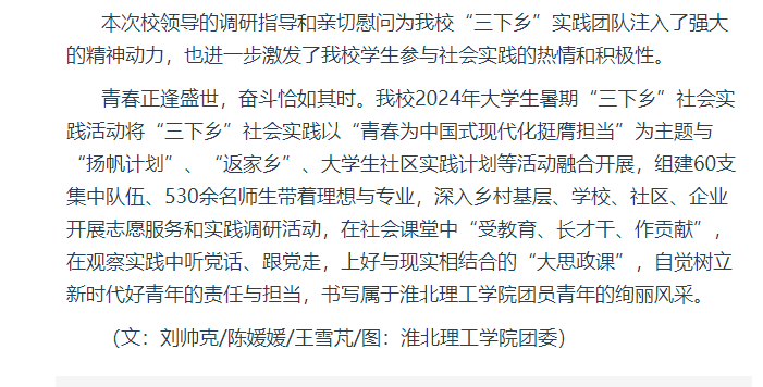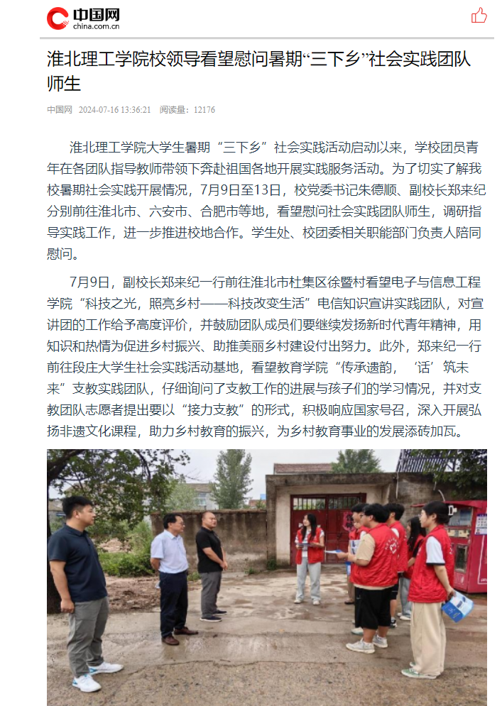 淮北理工学院大学生暑期“三下乡”社会实践活动启动以来,学校团员青年在各团队指导教师带领下奔赴祖国各地开展实践服务活动。为了切实了解我校暑期社会实践开展情况,7月9日至13日,校党委书记朱德顺、副校长郑来纪分别前往淮北市、六安市、合肥市等地,看望慰问社会实践团队师生,调研指导实践工作,进一步推进校地合作。学生处、校团委相关职能部门负责人陪同慰问。对此,中国网进行了报道:
