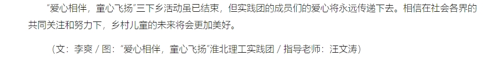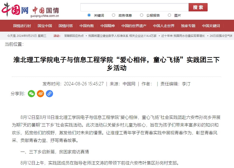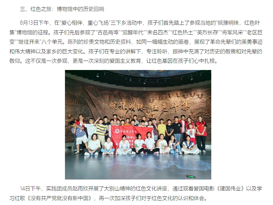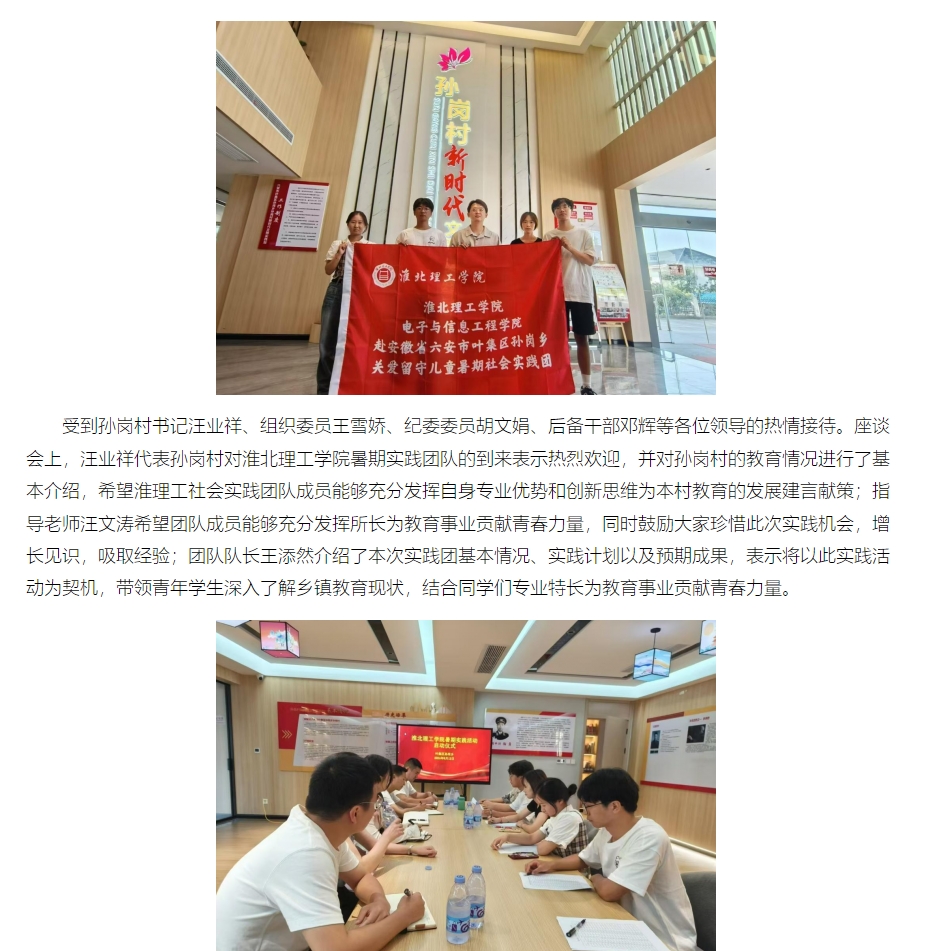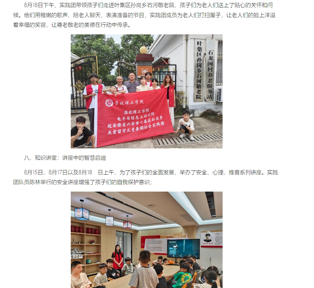 8月12日至8月18日淮北理工学院电子与信息工程学院“爱心相伴,童心飞扬”社会实践团赴六安市孙岗乡开展为期7天的暑期“三下乡”社会实践活动。此次活动以关爱乡村儿童为核心,旨在为孩子们带来丰富多彩的知识和欢乐,拓宽他们的视野,激发他们对未来的憧憬。让淮理工青年学子在青春实践中展现青春作为、彰显青春风采、贡献青春力量、抒写青春故事。对此,中国网中国国情进行了报道:
