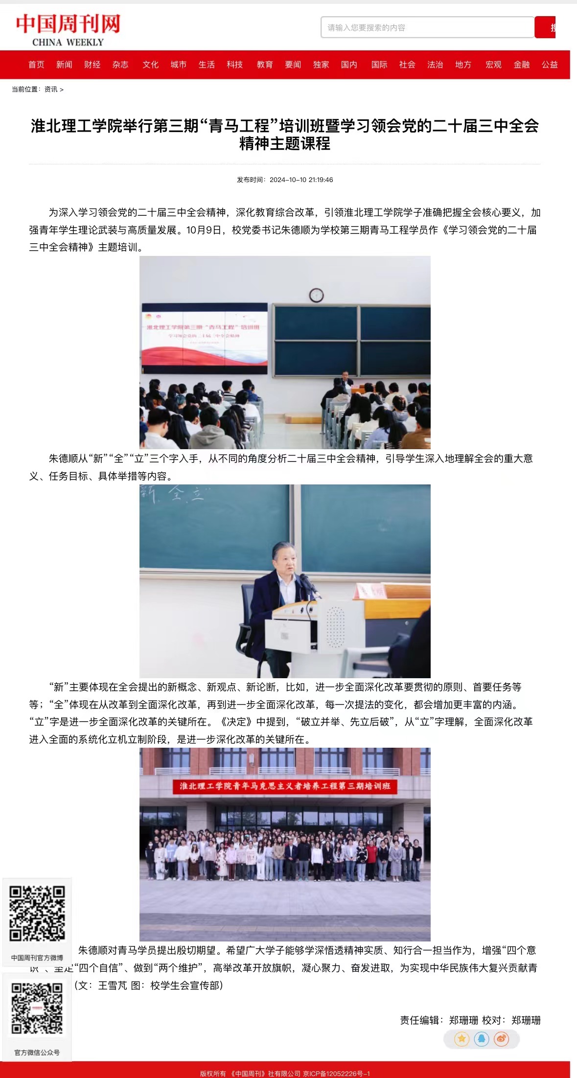 为深入学习领会党的二十届三中全会精神,深化教育综合改革,引领淮北理工学院学子准确把握全会核心要义,加强青年学生理论武装与高质量发展。10月9日,校党委书记朱德顺为学校第三期青马工程学员作《学习领会党的二十届三中全会精神》主题培训。对此,共青团中央主管媒体——中国周刊网进行了报道: