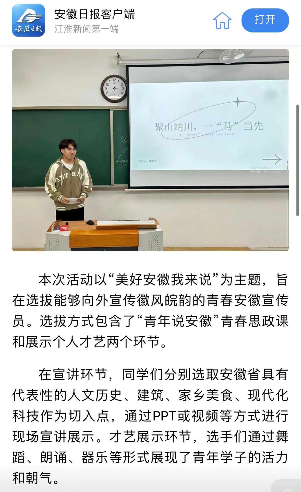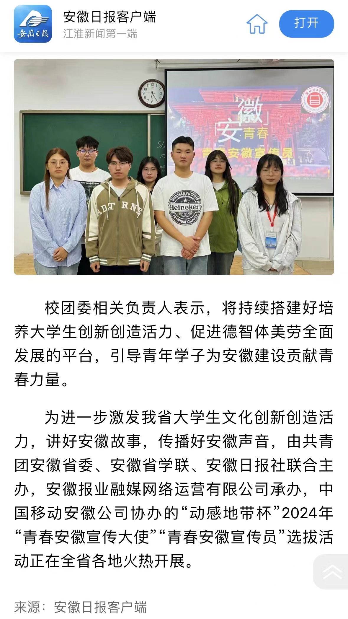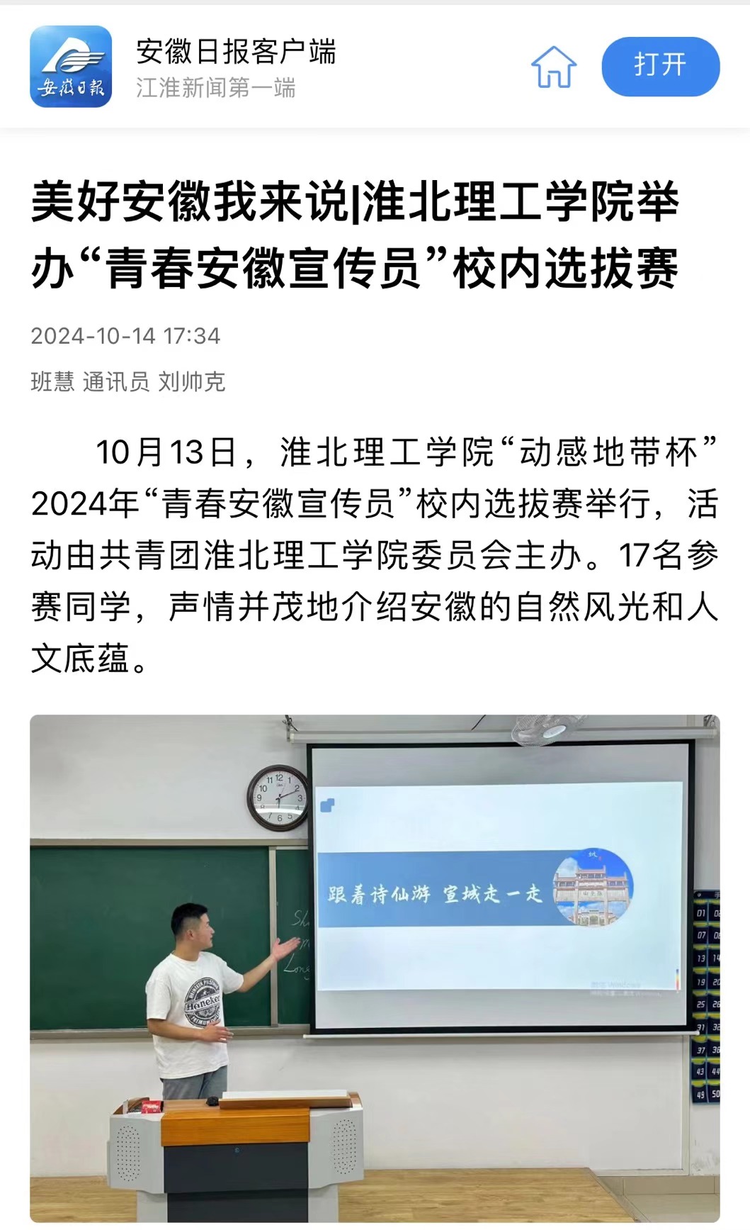 10月13日,淮北理工学院“动感地带杯”2024年“青春安徽宣传员”校内选拔赛举行,活动由共青团淮北理工学院委员会主办。17名参赛同学,声情并茂地介绍安徽的自然风光和人文底蕴。对此,安徽日报进行了报道: