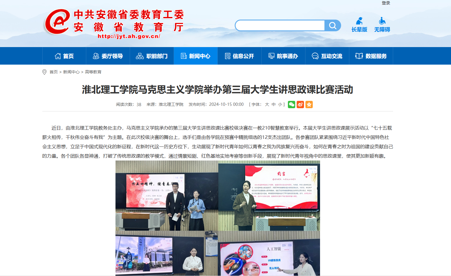 近日,由淮北理工学院教务处主办,马克思主义学院承办的第三届大学生讲思政课比赛校级决赛在一教210智慧教室举行。本届大学生讲思政课展示活动以“七十五载薪火相传,千秋伟业奋斗有我”为主题。在此次校级决赛的舞台上,选手们是由各学院在预赛中精挑细选的12支杰出团队。各参赛团队紧紧围绕习近平新时代中国特色社会主义思想,立足于中国式现代化的新征程,在新时代这一历史方位下,生动展现了新时代青年如何以青春之我为民族复兴而奋斗,如何在青春之时为祖国的建设贡献自己的力量。各个团队各显神通,打破了传统思政课的教学模式,通过情景短剧、红色基地实地考察等创新手段,展现了新时代青年视角中的思政课堂,使其更加新颖有趣。对此,安徽教育网进行了报道: