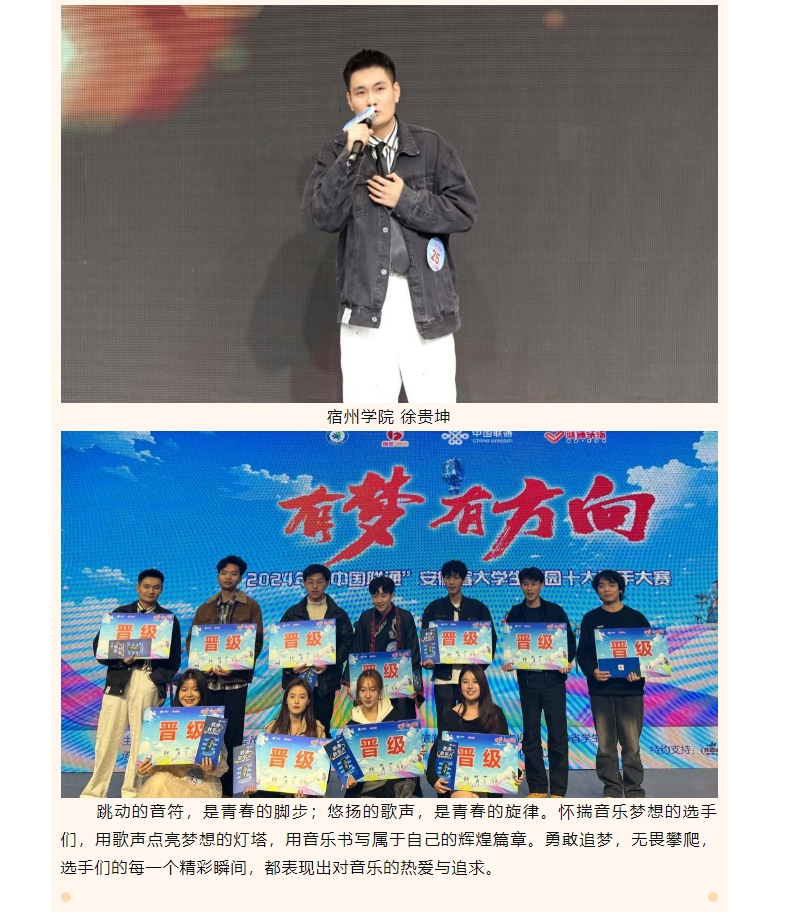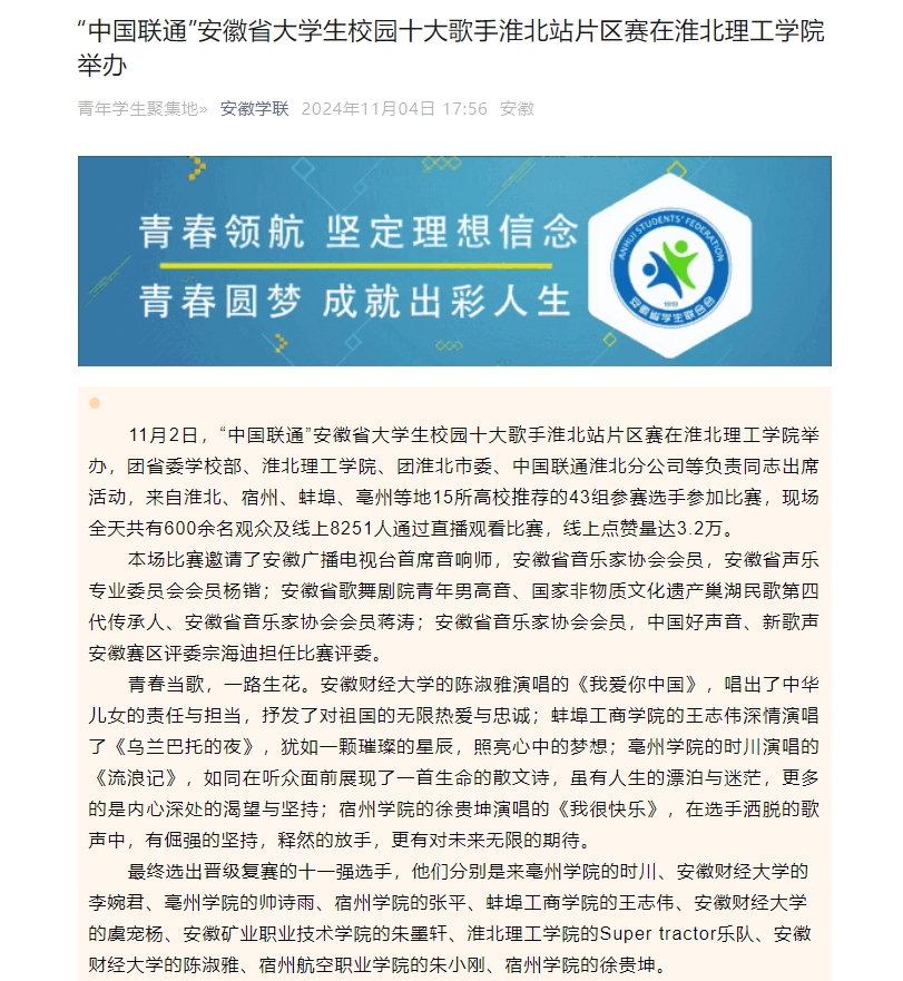 11月2日,“中国联通”安徽省大学生校园十大歌手淮北站片区赛在淮北理工学院举办,团省委学校部、淮北理工学院、团淮北市委、中国联通淮北分公司等负责同志出席活动,来自淮北、宿州、蚌埠、亳州等地15所高校推荐的43组参赛选手参加比赛,现场全天共有600余名观众及线上8251人通过直播观看比赛,线上点赞量达3.2万。对此,安徽学联进行了报道: