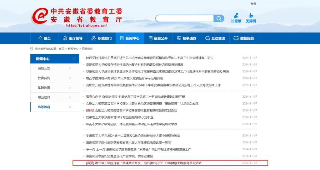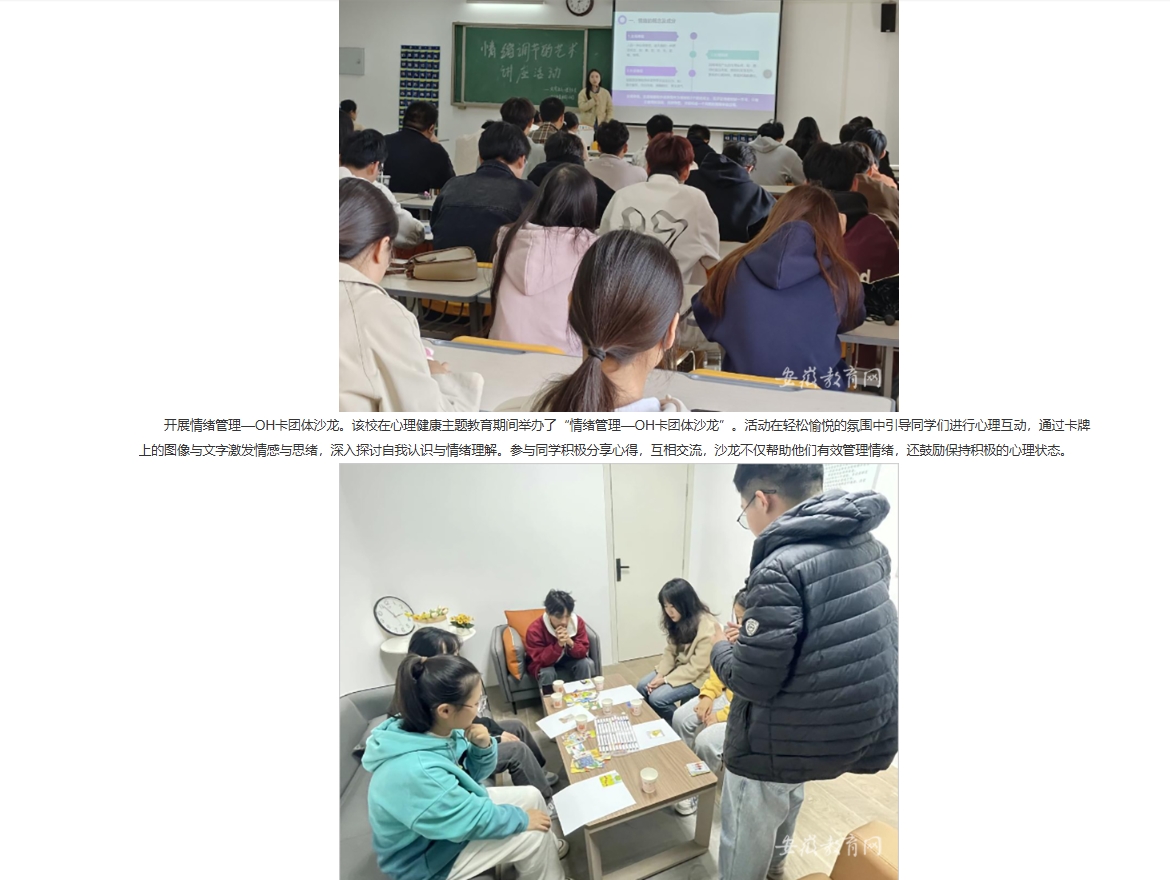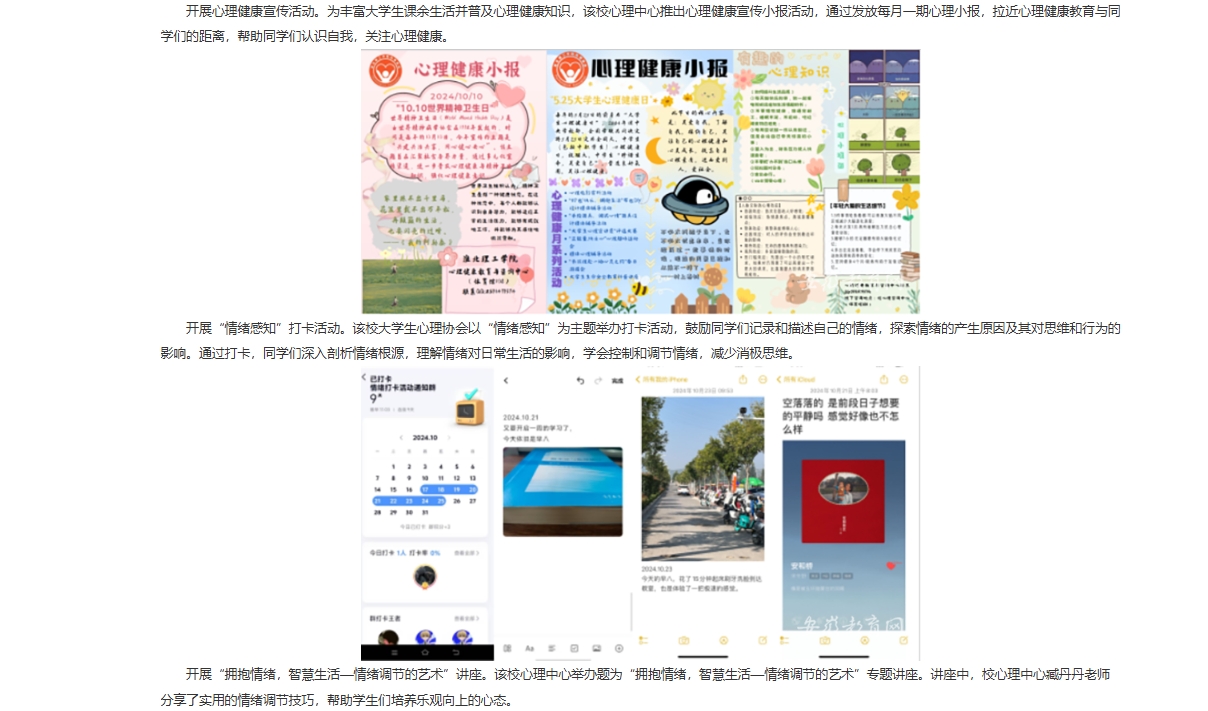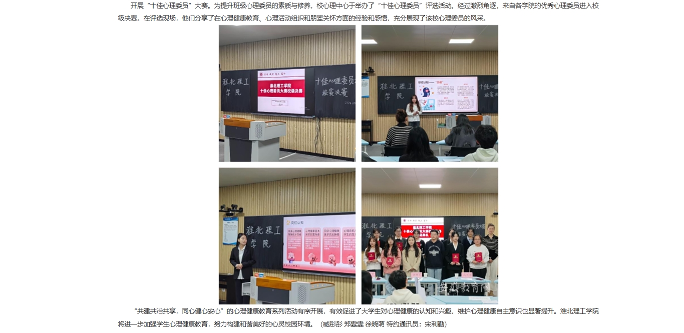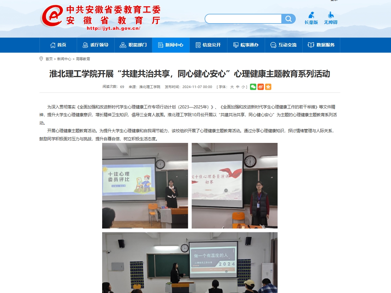 为深入贯彻落实《全面加强和改进新时代学生心理健康工作专项行动计划(2023—2025年)》、《全面加强和改进新时代学生心理健康工作的若干举措》等文件精神,提升大学生心理健康意识,增长精神卫生知识,倡导三全育人氛围。淮北理工学院10月份开展以“共建共治共享,同心健心安心”为主题的心理健康主题教育系列活动。对此,安徽教育网进行了报道: