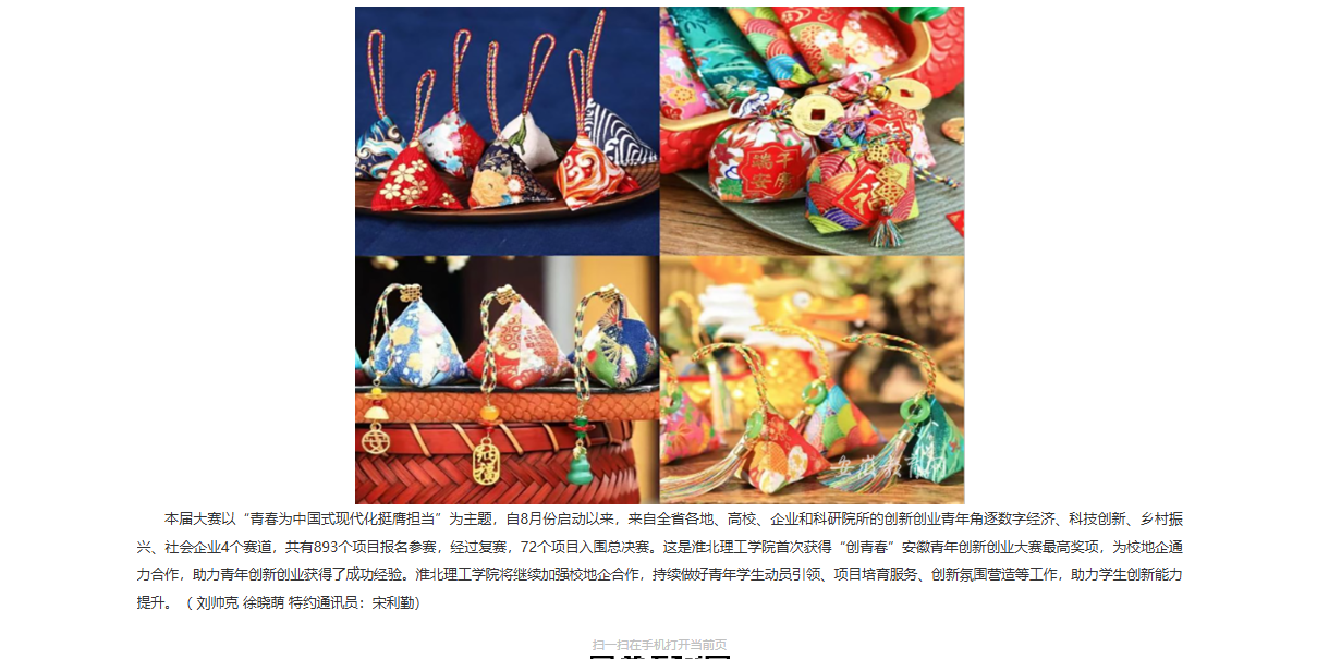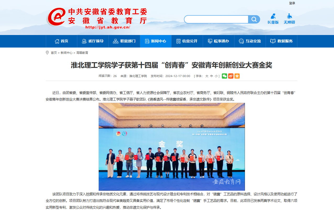 近日,由团省委、省委宣传部、省委网信办、省工信厅、省人力资源社会保障厅、省农业农村厅、省商务厅、省妇联、铜陵市人民政府联合主办的第十四届“创青春”安徽青年创新创业大赛决赛结果公布。淮北理工学院学子聂子歆团队《锦香遗风--传锦囊续留香,承非遗文脉传》项目荣获金奖。对此,安徽教育网进行了报道: