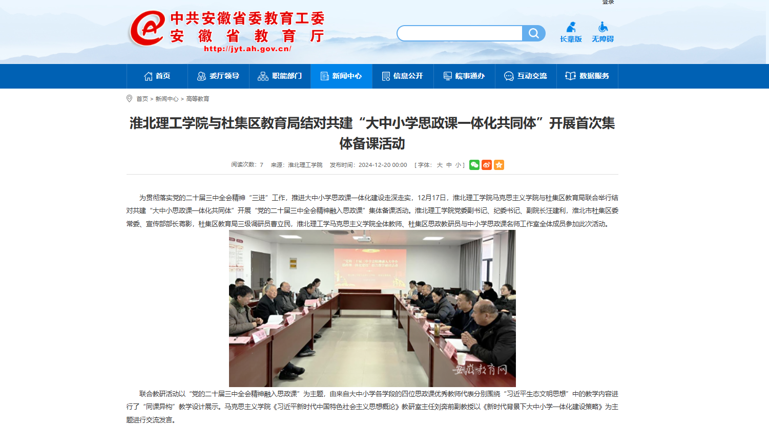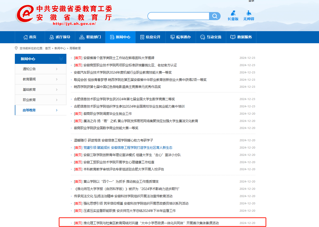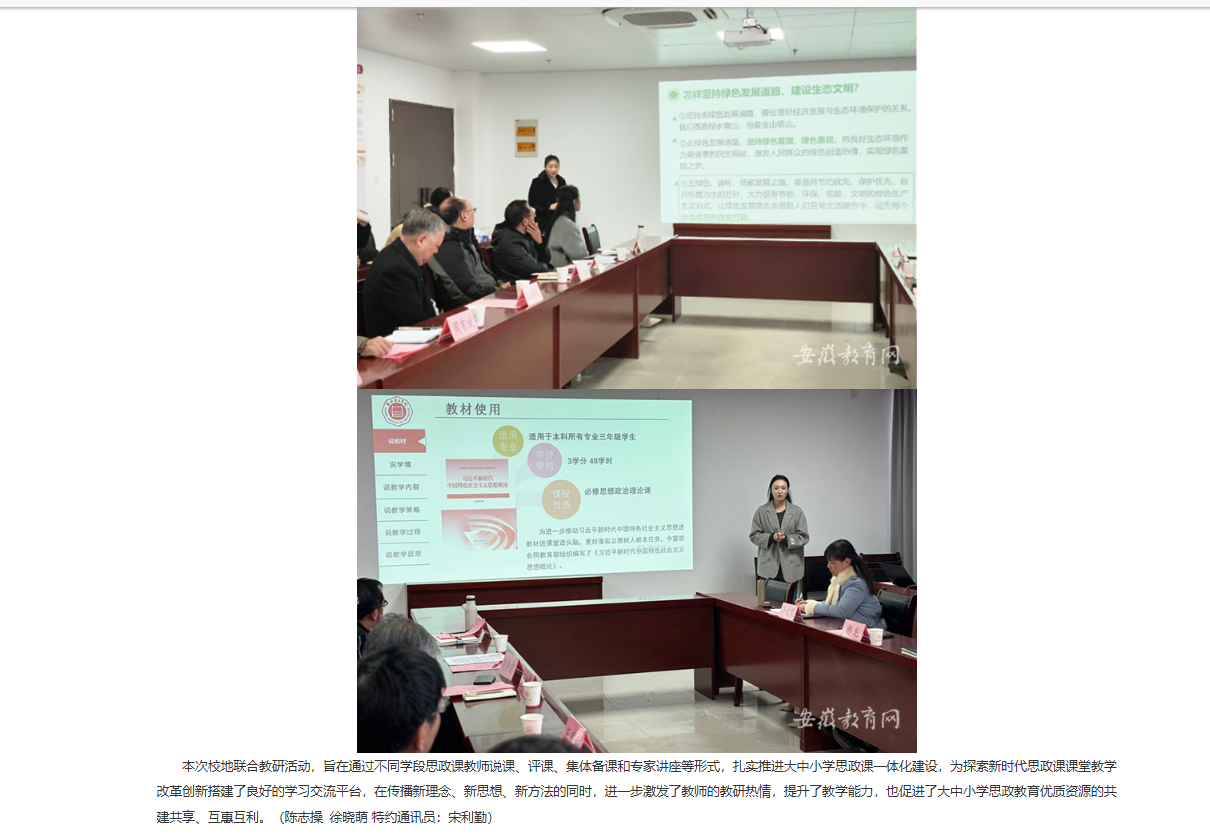 为贯彻落实党的二十届三中全会精神“三进”工作,推进大中小学思政课一体化建设走深走实,12月17日,淮北理工学院马克思主义学院与杜集区教育局联合举行结对共建“大中小思政课一体化共同体”开展“党的二十届三中全会精神融入思政课”集体备课活动。淮北理工学院党委副书记、纪委书记、副院长汪建利,淮北市杜集区委常委、宣传部部长蒋影,杜集区教育局三级调研员曹立民,淮北理工学马克思主义学院全体教师、杜集区思政教研员与中小学思政课名师工作室全体成员参加此次活动。对此,安徽教育网进行了报道: