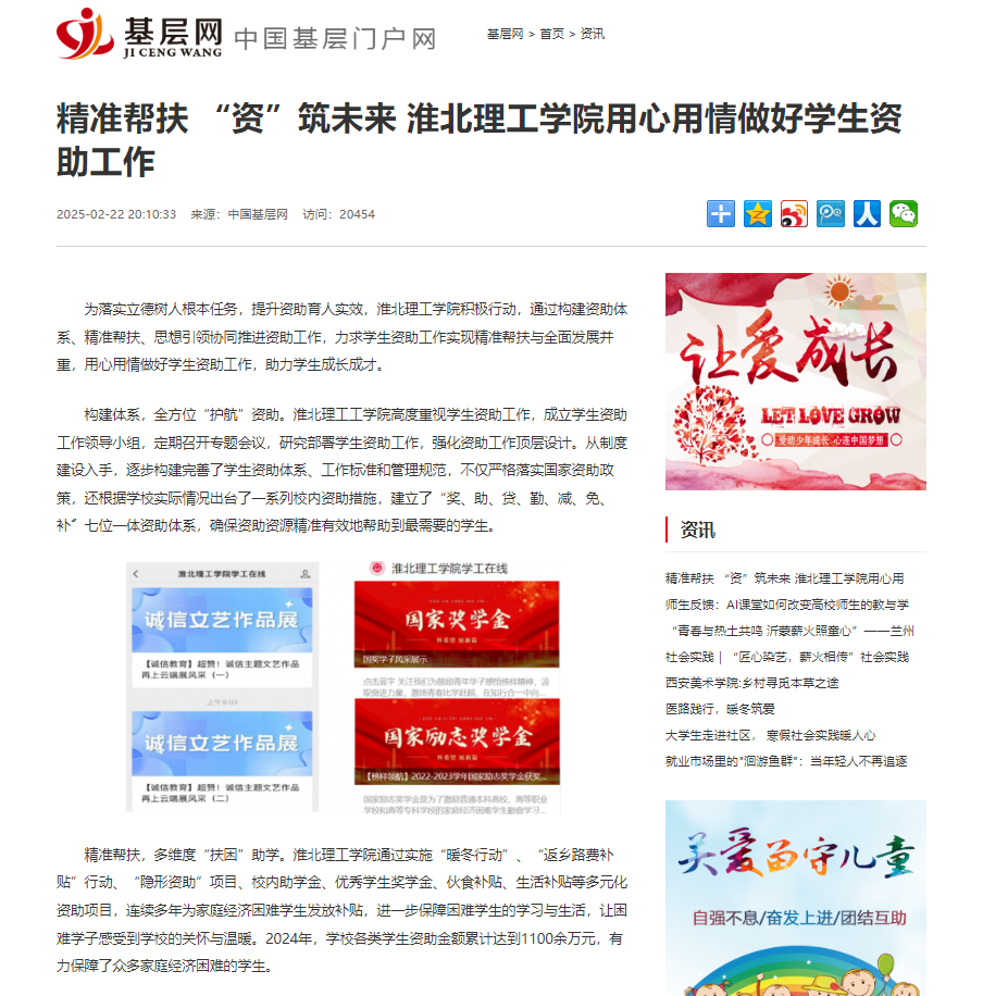 为落实立德树人根本任务,提升资助育人实效,淮北理工学院积极行动,通过构建资助体系、精准帮扶、思想引领协同推进资助工作,力求学生资助工作实现精准帮扶与全面发展并重,用心用情做好学生资助工作,助力学生成长成才。对此,基层网进行了报道: