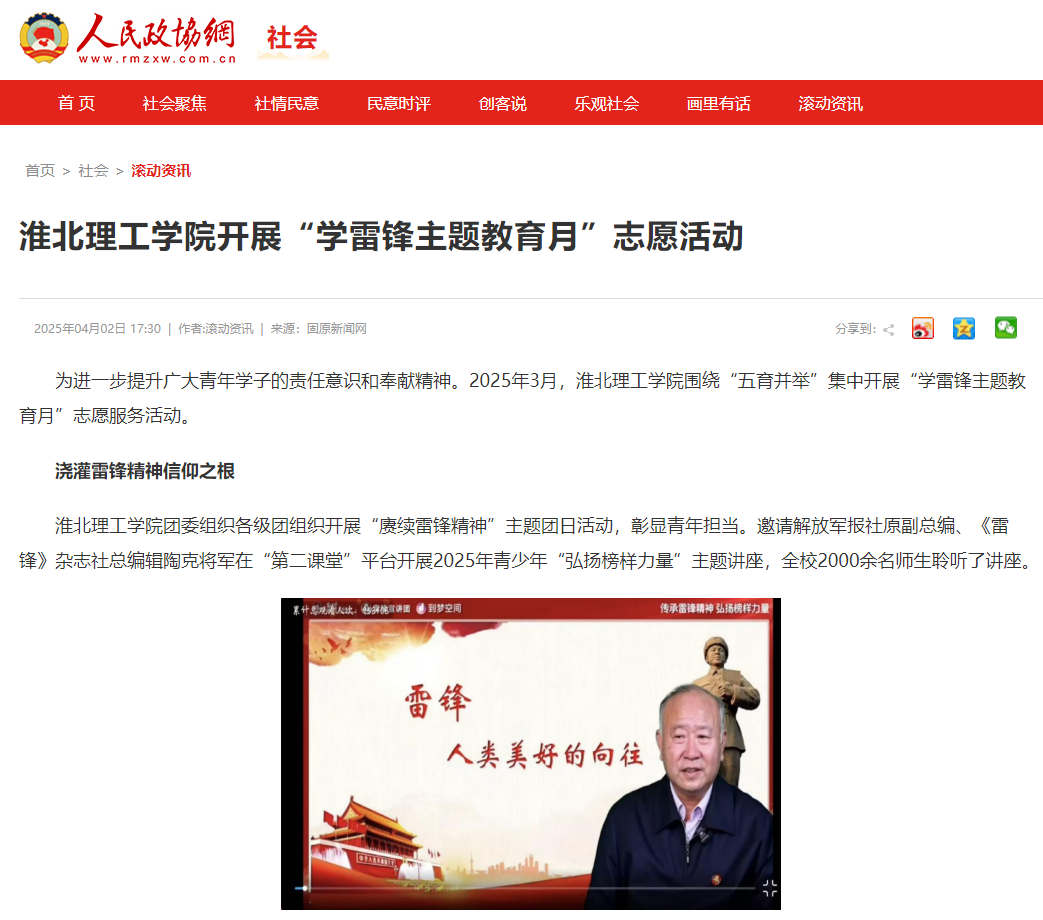 为进一步提升广大青年学子的责任意识和奉献精神。2025年3月,淮北理工学院围绕“五育并举”集中开展“学雷锋主题教育月”志愿服务活动。对此,人民政协网进行了报道: