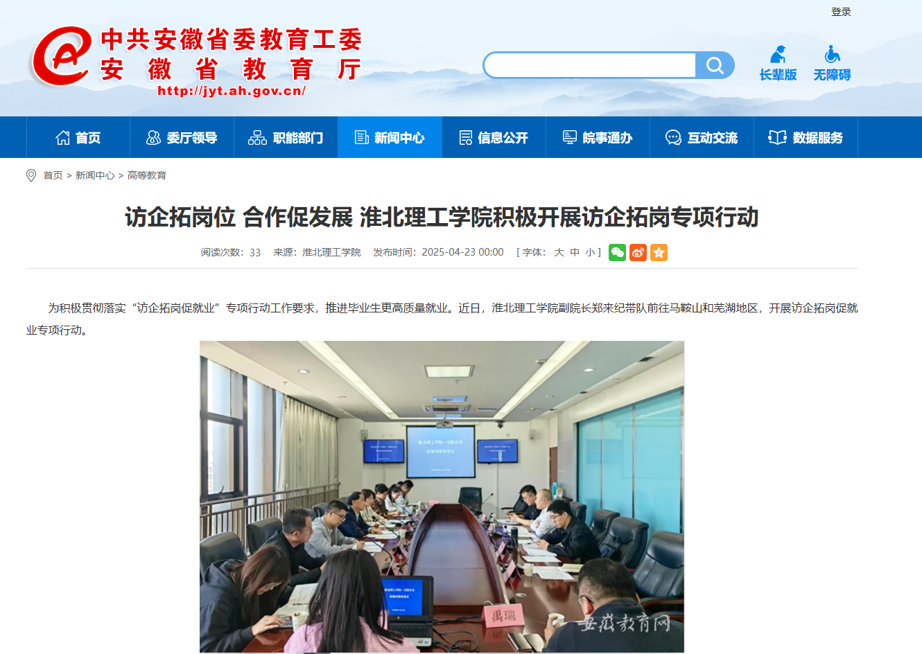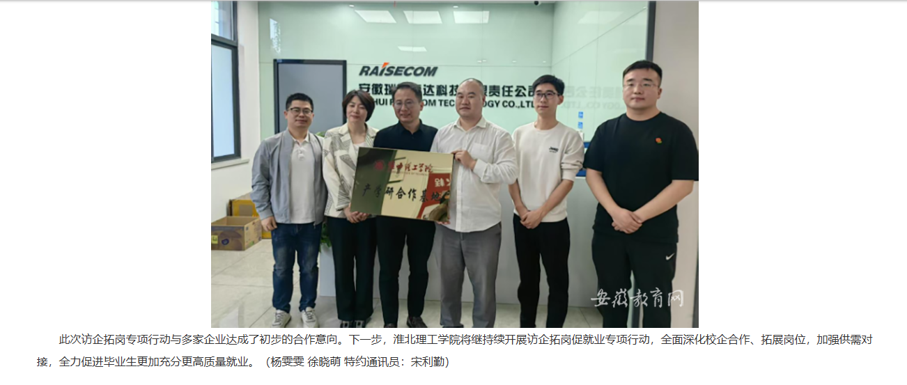 为积极贯彻落实“访企拓岗促就业”专项行动工作要求,推进毕业生更高质量就业。近日,淮北理工学院副院长郑来纪带队前往马鞍山和芜湖地区,开展访企拓岗促就业专项行动。对此,安徽教育网进行了报道: