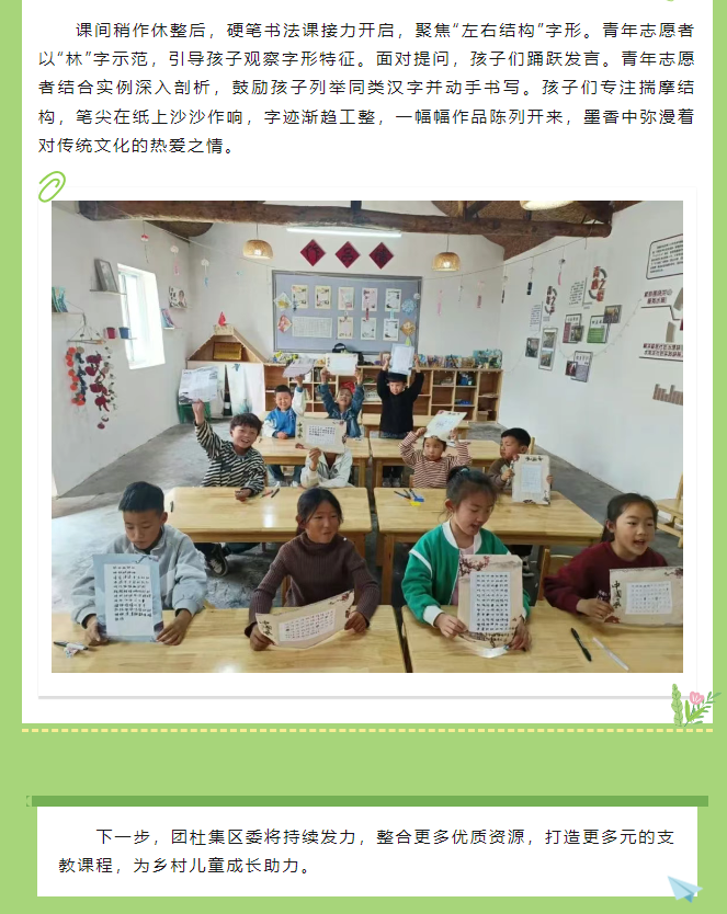 2025年4月19日,团区委联合红淮儿支教社走进梧桐村,开展“七彩周末”支教活动,以“摇摆小人”手工制作与“左右结构”硬笔书法两大课堂,为乡村儿童开启一场趣味与知识兼具的周末之旅。对此,杜集共青团进行了报道: