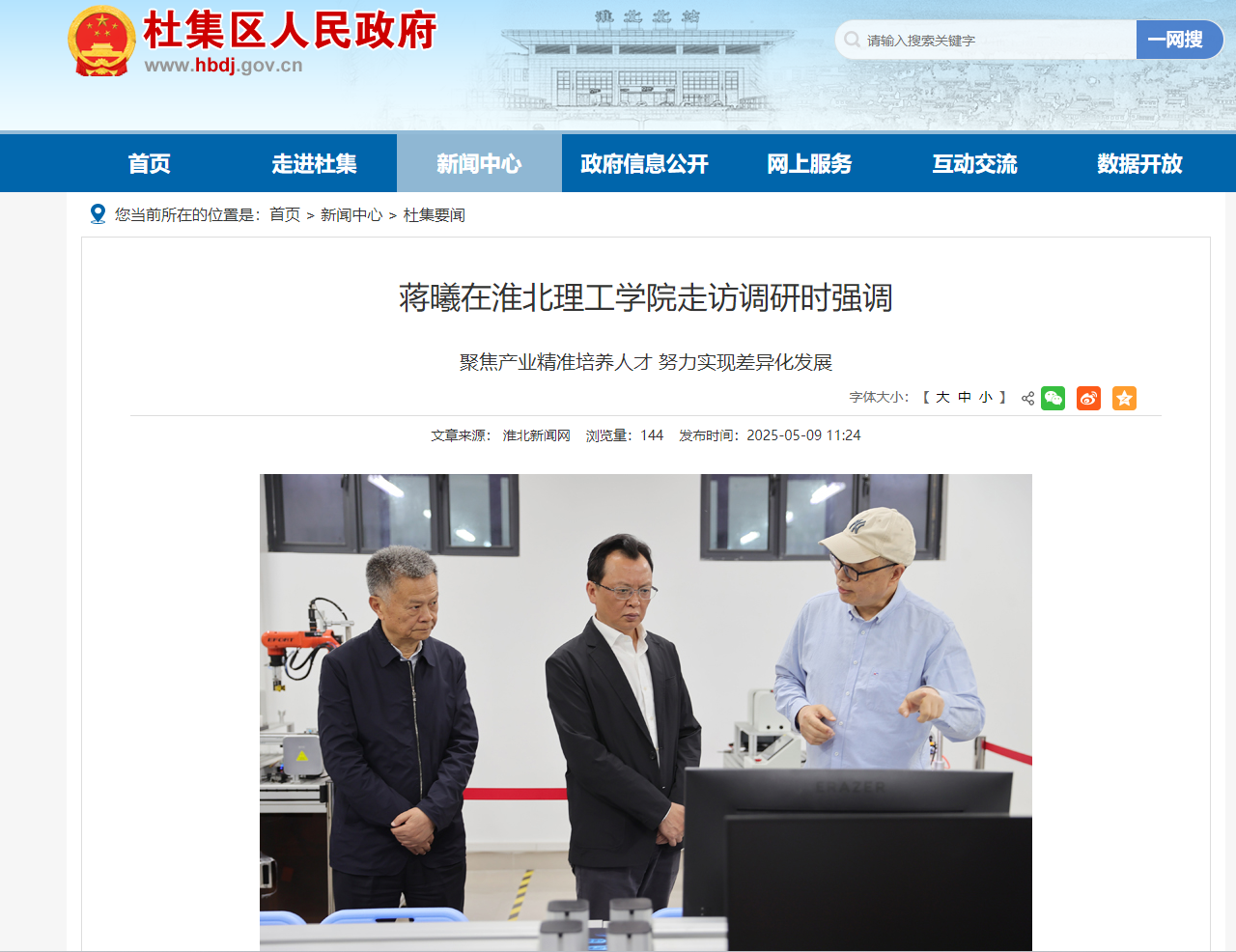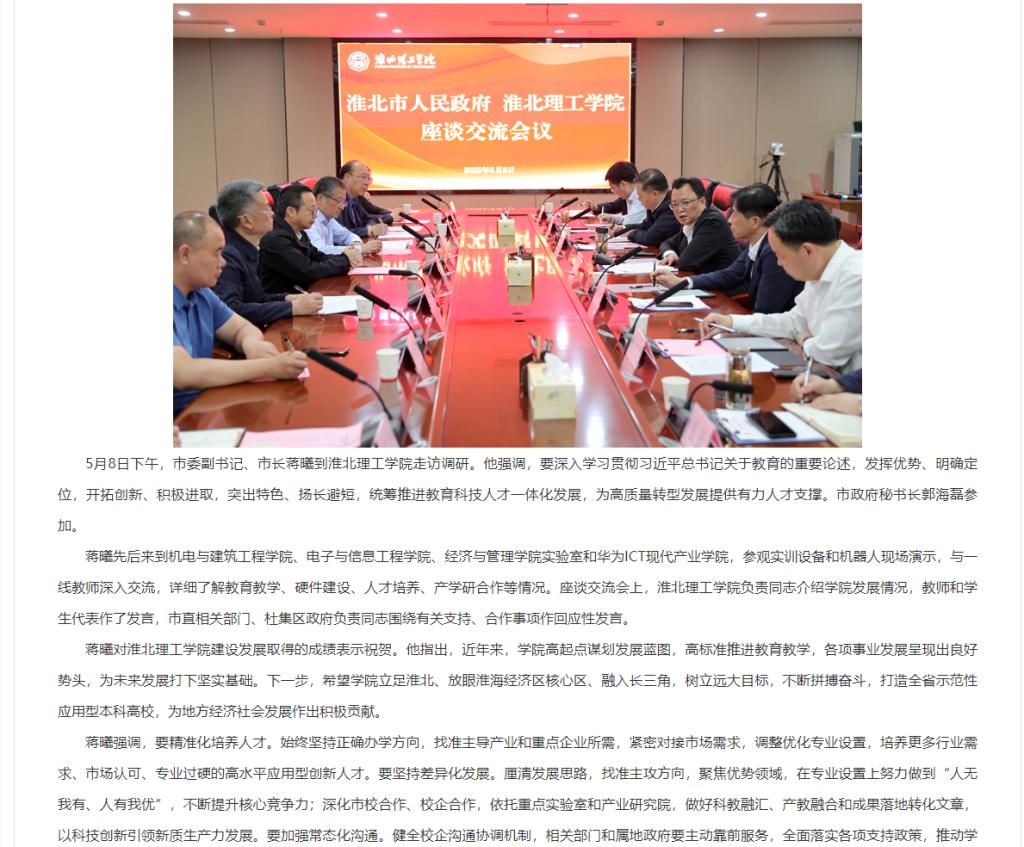 5月8日下午,市委副书记、市长蒋曦到淮北理工学院走访调研。他强调,要深入学习贯彻习近平总书记关于教育的重要论述,发挥优势、明确定位,开拓创新、积极进取,突出特色、扬长避短,统筹推进教育科技人才一体化发展,为高质量转型发展提供有力人才支撑。市政府秘书长郭海磊参加。对此,杜集区人民政府进行了报道: