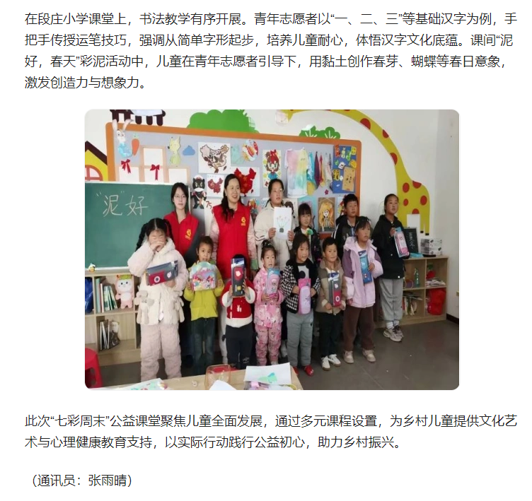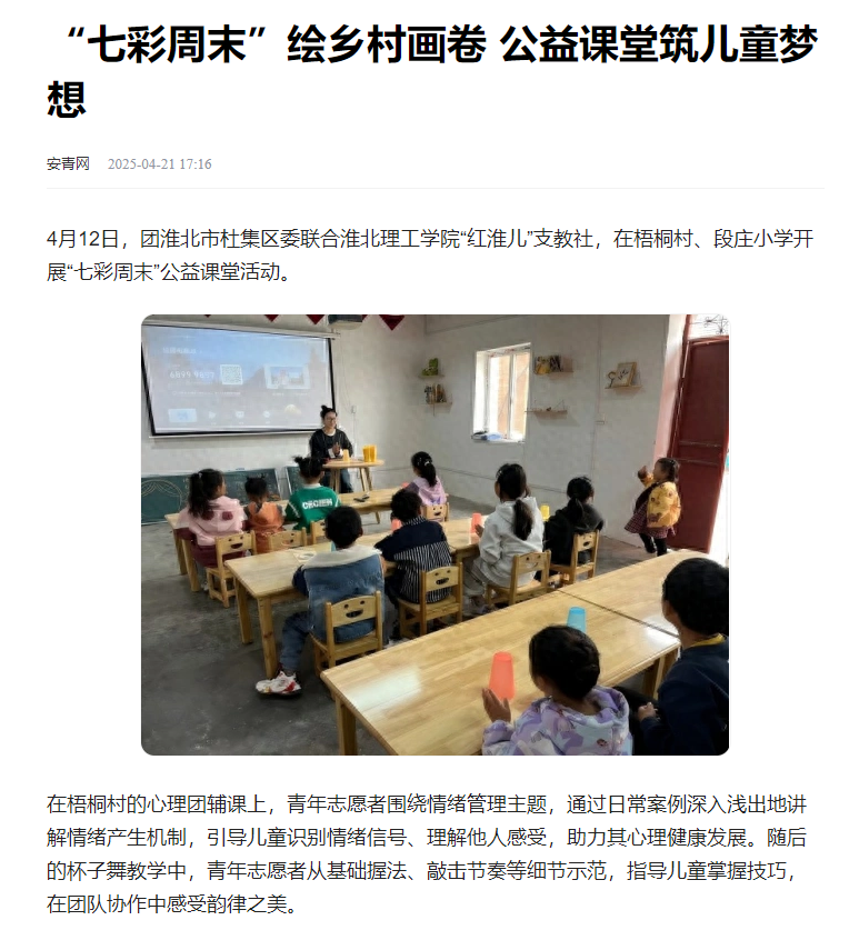 4月12日,团淮北市杜集区委联合淮北理工学院“红淮儿”支教社,在梧桐村、段庄小学开展“七彩周末”公益课堂活动。对此,安青网进行了报道: