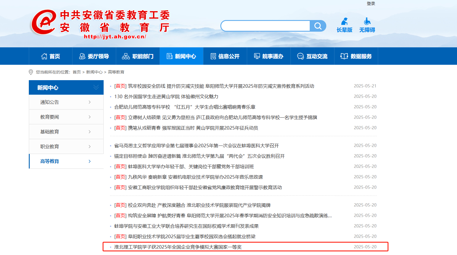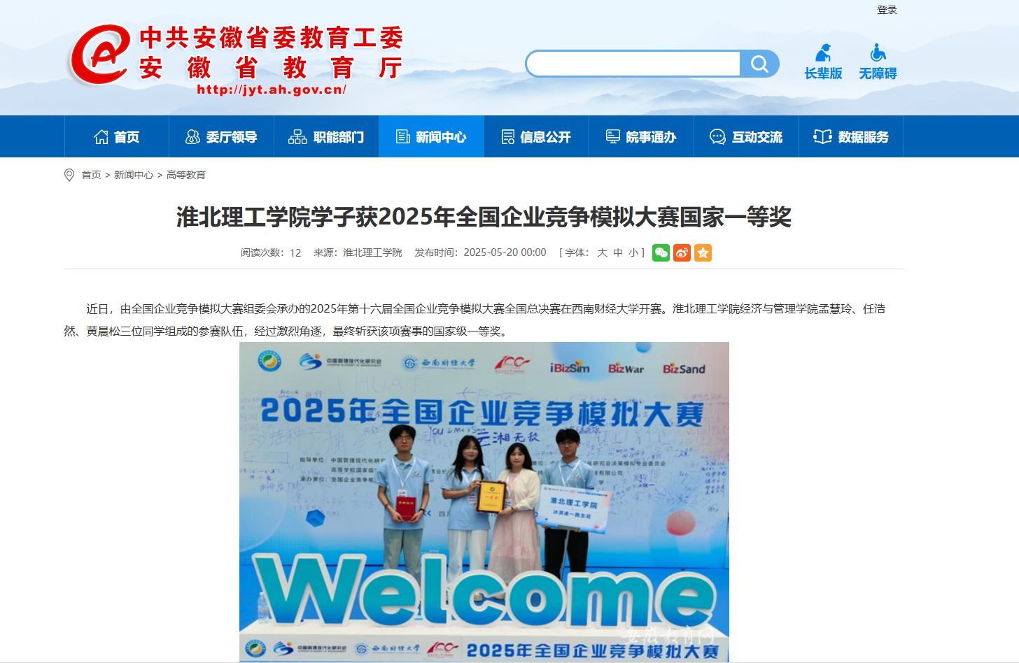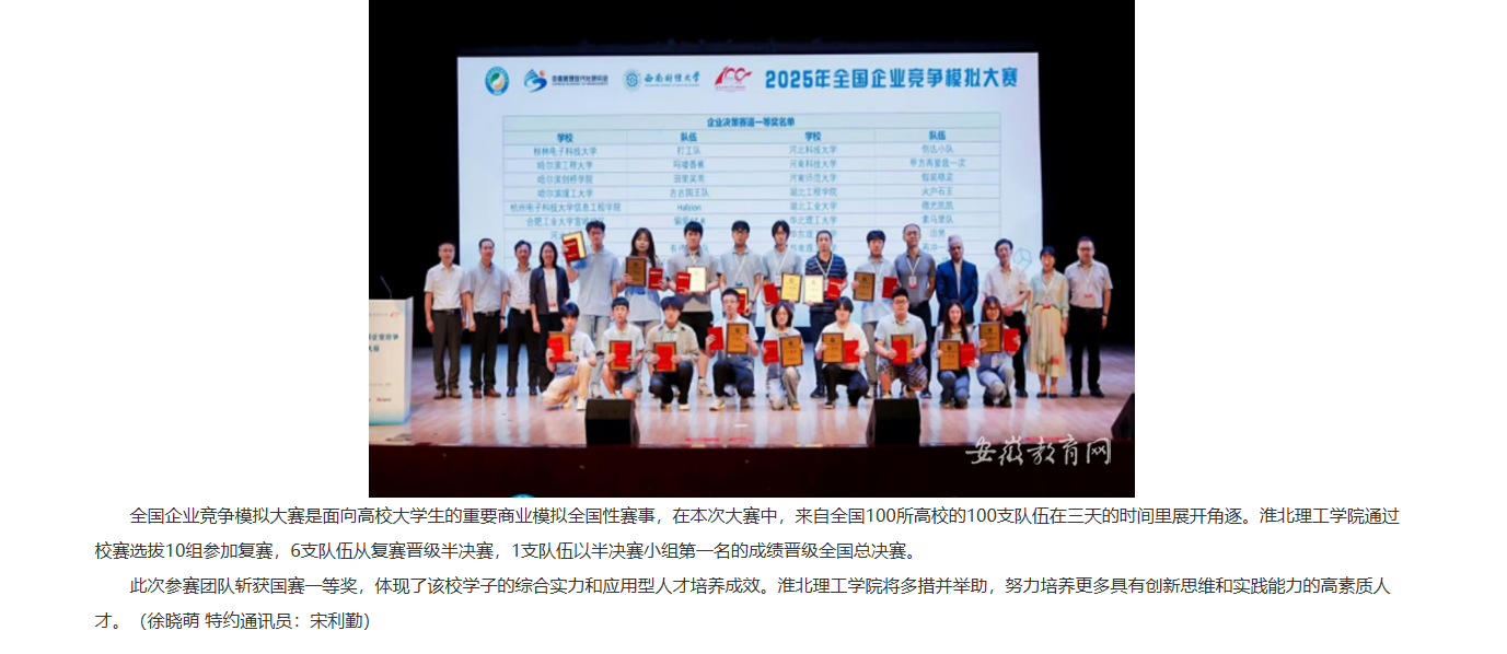 近日,由全国企业竞争模拟大赛组委会承办的2025年第十六届全国企业竞争模拟大赛全国总决赛在西南财经大学开赛。淮北理工学院经济与管理学院孟慧玲、任浩然、黄晨松三位同学组成的参赛队伍,经过激烈角逐,最终斩获该项赛事的国家级一等奖。对此,安徽教育网进行了报道: