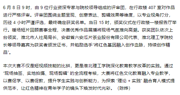 自4月11日启动,历经理论考试、初赛选拔等环节,6月8日下午,由淮北市人社局主办、淮北理工学院承办、安徽省六安瓜片茶业股份有限公司(徽六)赞助的淮北市“理工学院—徽六杯”第一届短视频技能大赛决赛在淮北理工学院圆满收官。这场吸引215支队伍、625名师生同场竞技的赛事,以“红色传承,青春映像”为主题,让淮北青年用镜头诠释红色文化,为红色精神传播注入青春力量。对此,都市之声进行了报道: