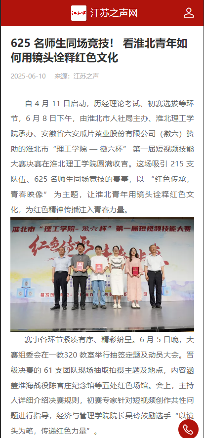 自4月11日启动,历经理论考试、初赛选拔等环节,6月8日下午,由淮北市人社局主办、淮北理工学院承办、安徽省六安瓜片茶业股份有限公司(徽六)赞助的淮北市“理工学院—徽六杯” 第一届短视频技能大赛决赛在淮北理工学院圆满收官。这场吸引215支队伍、625名师生同场竞技的赛事,以 “红色传承,青春映像” 为主题,让淮北青年用镜头诠释红色文化,为红色精神传播注入青春力量。对此,江苏之声进行了报道: