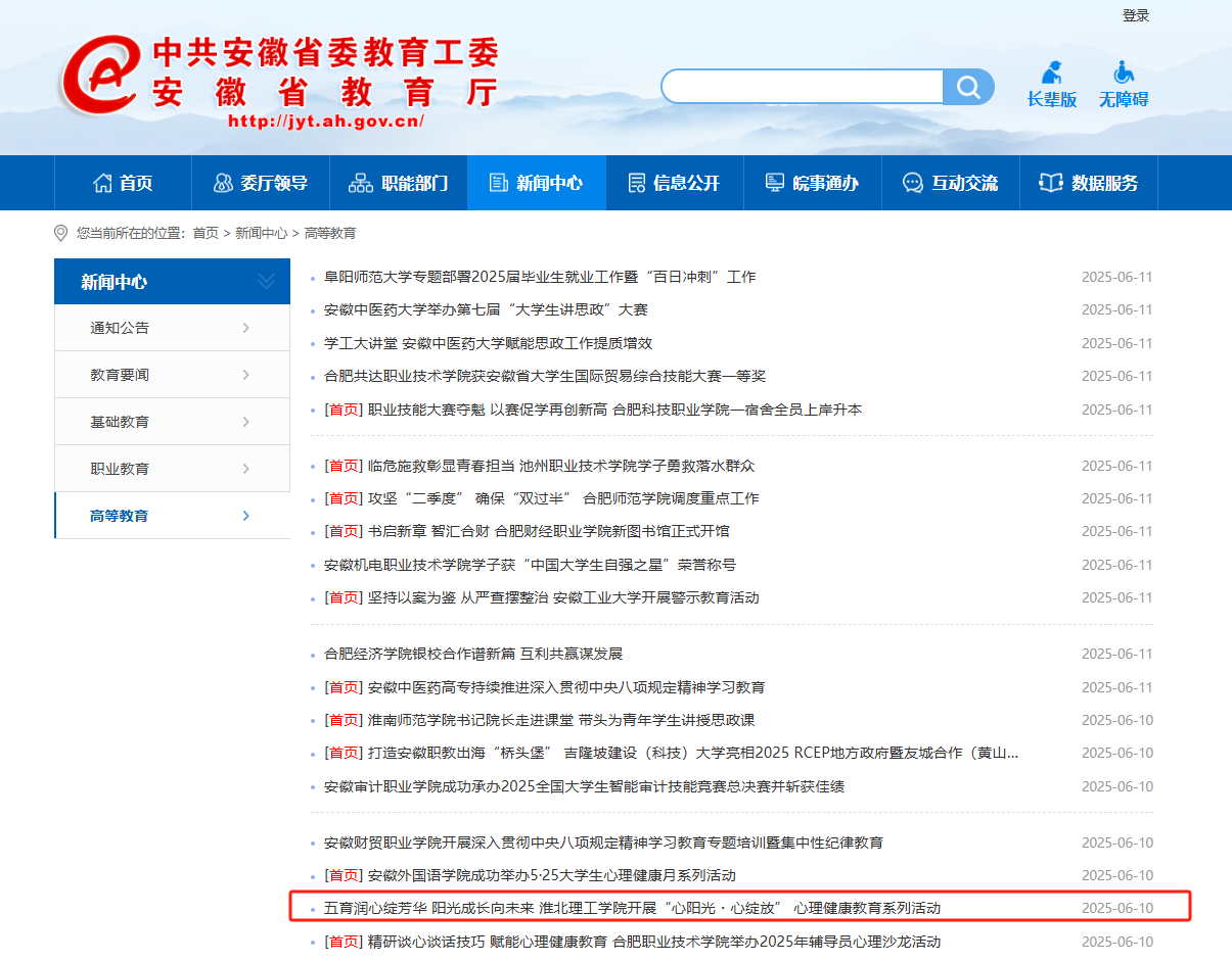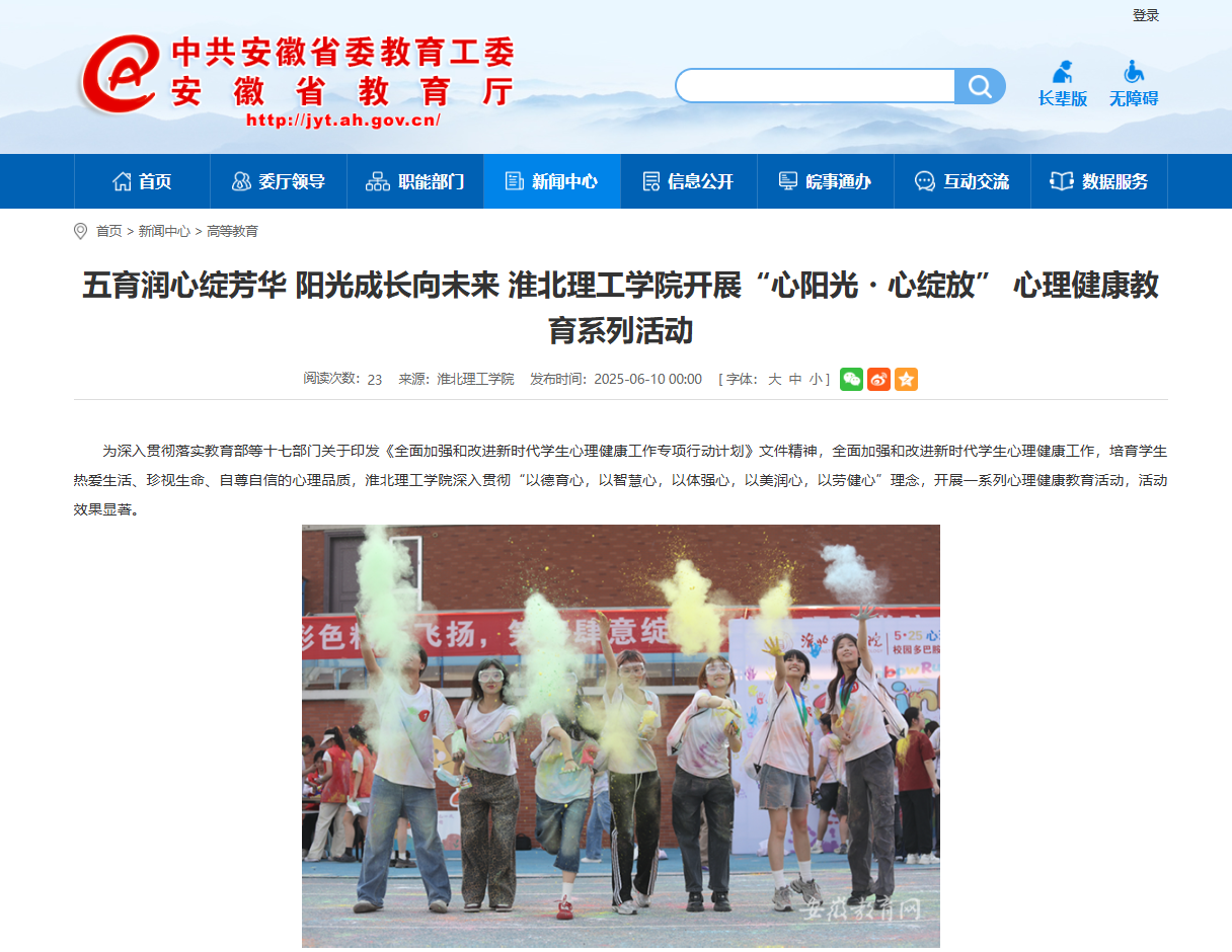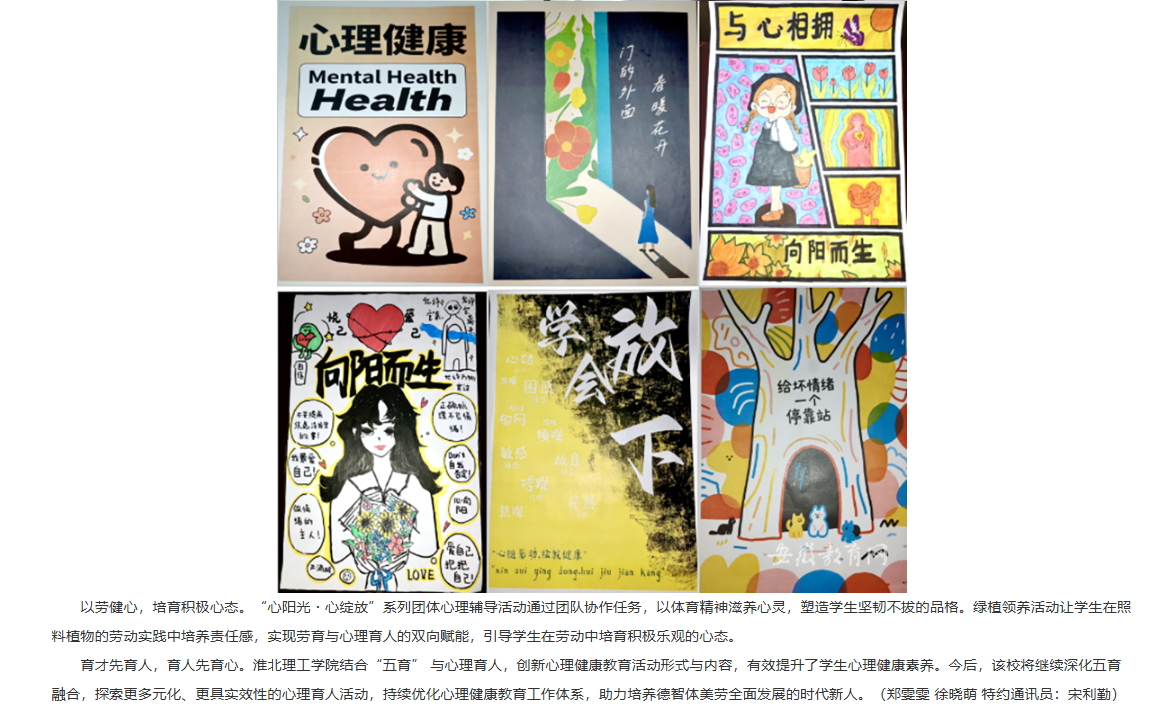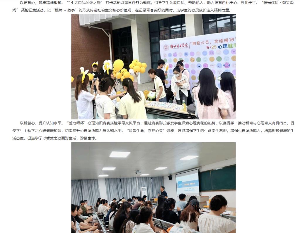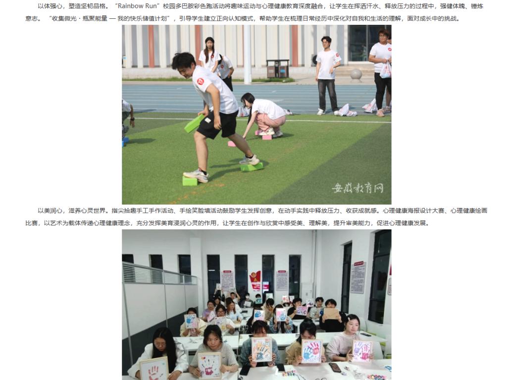 为深入贯彻落实教育部等十七部门关于印发《全面加强和改进新时代学生心理健康工作专项行动计划》文件精神,全面加强和改进新时代学生心理健康工作,培育学生热爱生活、珍视生命、自尊自信的心理品质,淮北理工学院深入贯彻“以德育心,以智慧心,以体强心,以美润心,以劳健心”理念,开展一系列心理健康教育活动,活动效果显著。对此,安徽教育网进行了报道: