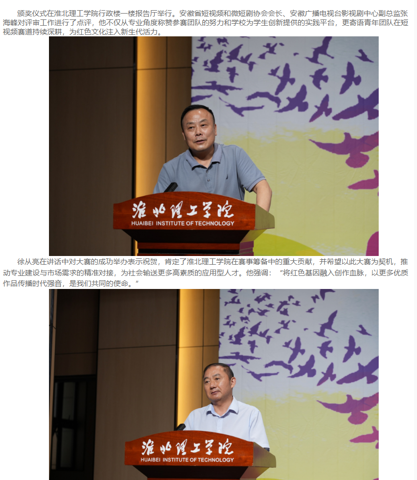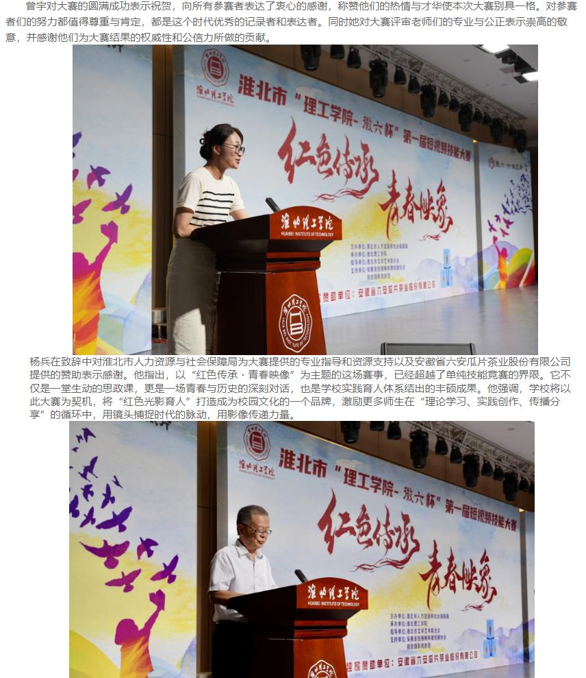 近期,淮北市“理工学院杯”第一届短视频技能大赛在淮北理工学院圆满落下帷幕。本次大赛由淮北市人社局主办,淮北理工学院承办,安徽省六安瓜片茶业股份有限公司独家赞助。淮北理工学院校长杨兵,淮北市人力资源和社会保障局局长徐从亮、副局长张华,安徽省六安瓜片茶业股份有限公司电商运营负责人曾宇,以及相关领导观摩比赛并参加颁奖典礼。对此,中经视点网进行了报道: